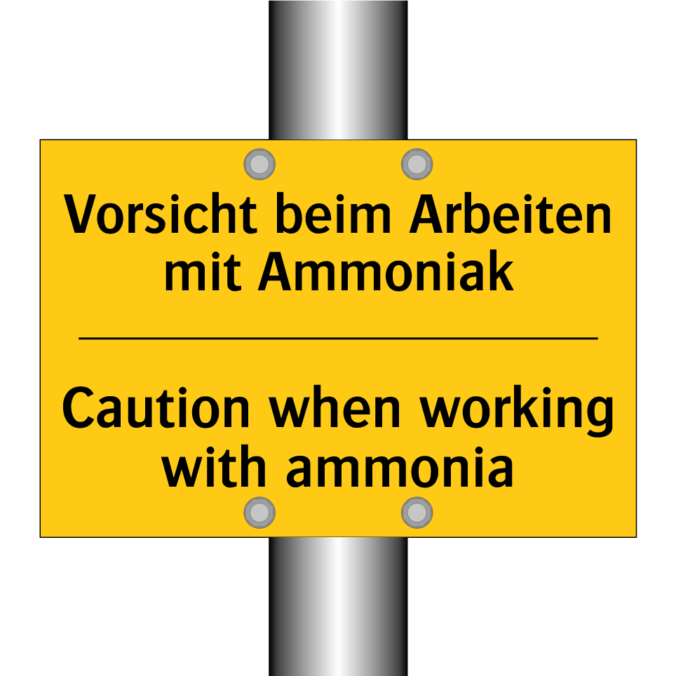 Zweisprachiges Warnschild mit deutschem Text Vorsicht beim Arbeiten mit Ammoniak und englischem Text Caution when working with ammonia