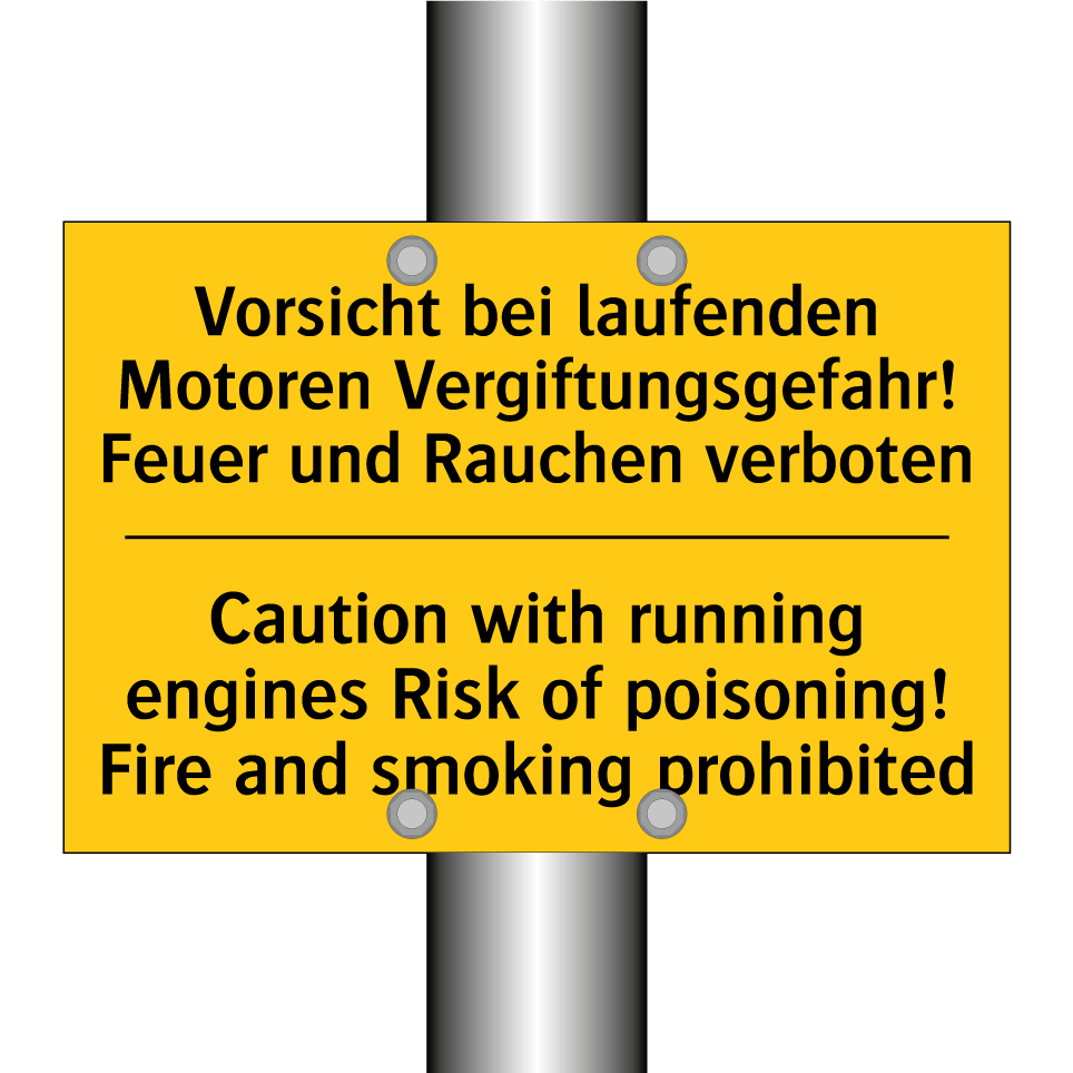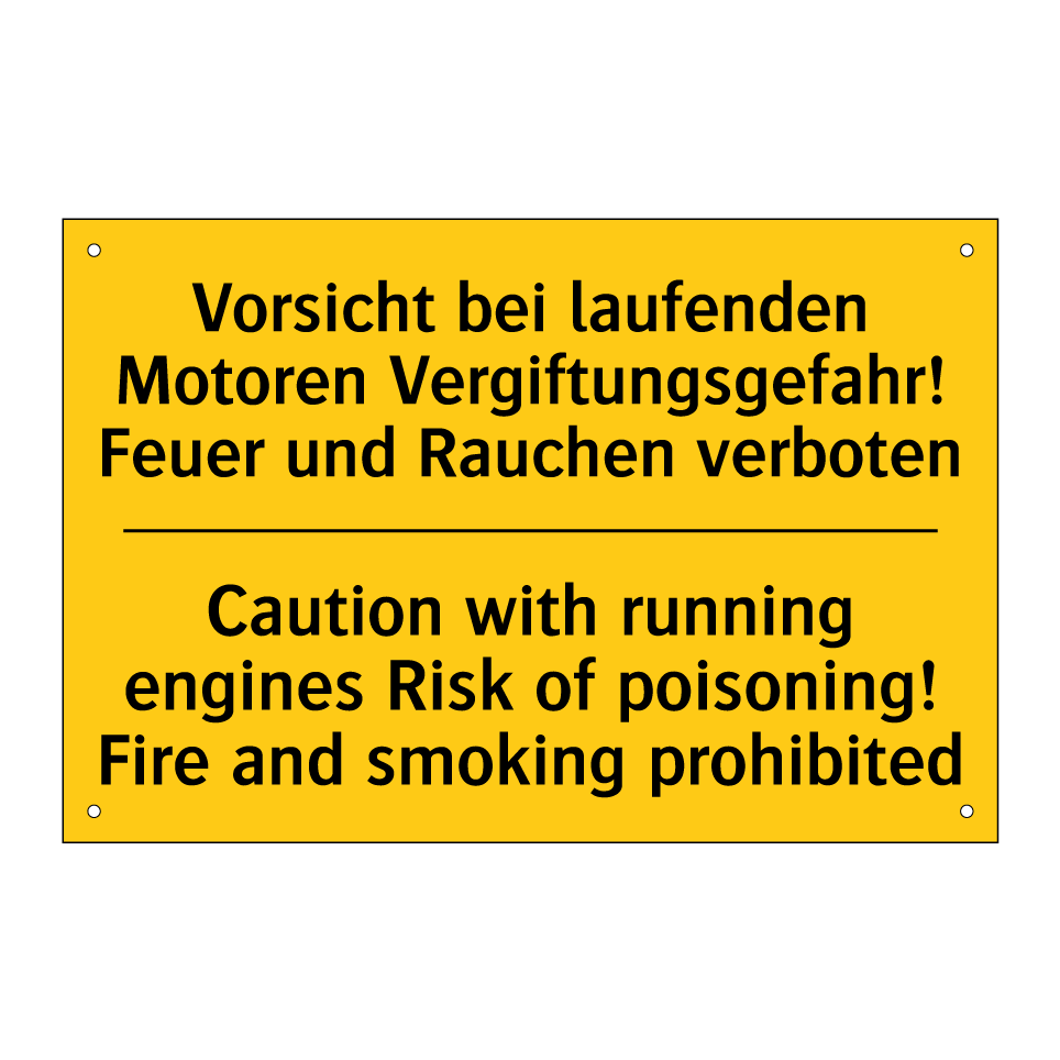 Zweisprachiges Warnschild mit deutschem Text Vorsicht bei laufenden Motoren Vergiftungsgefahr! Feuer und Rauchen verboten und englischem Text Caution with running engines Risk of poisoning! Fire and smoking prohibited