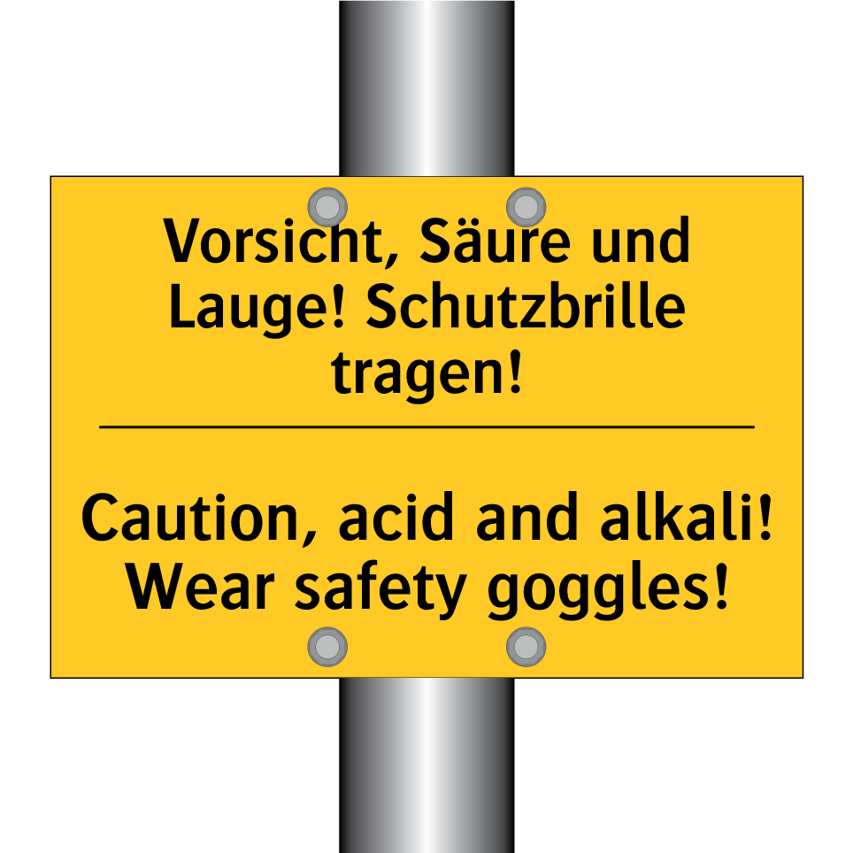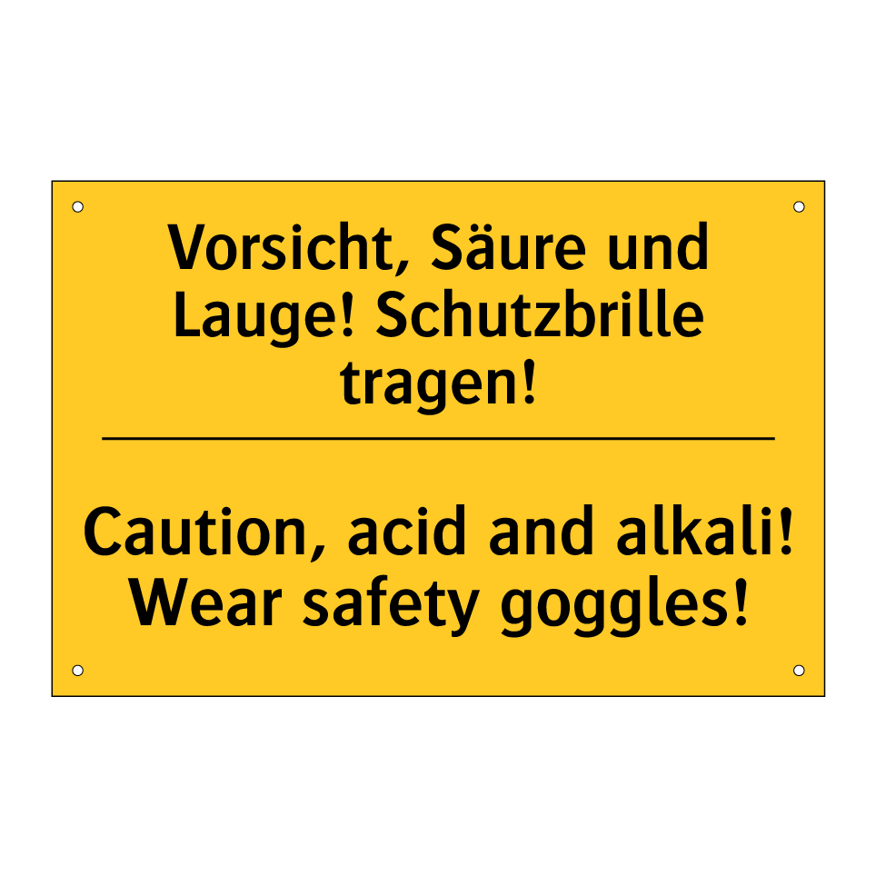 Zweisprachiges Warnschild mit deutschem Text Vorsicht, Säure und Lauge! Schutzbrille tragen! und englischem Text Caution, acid and alkali! Wear safety goggles!