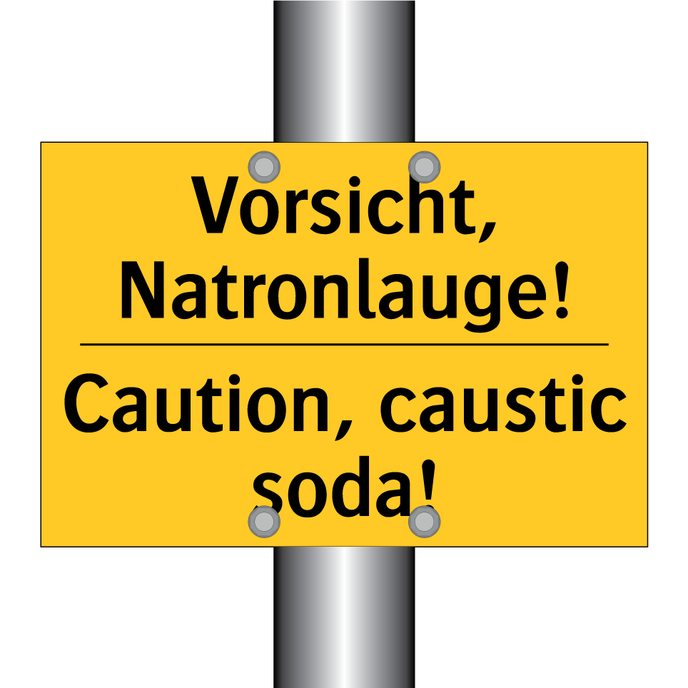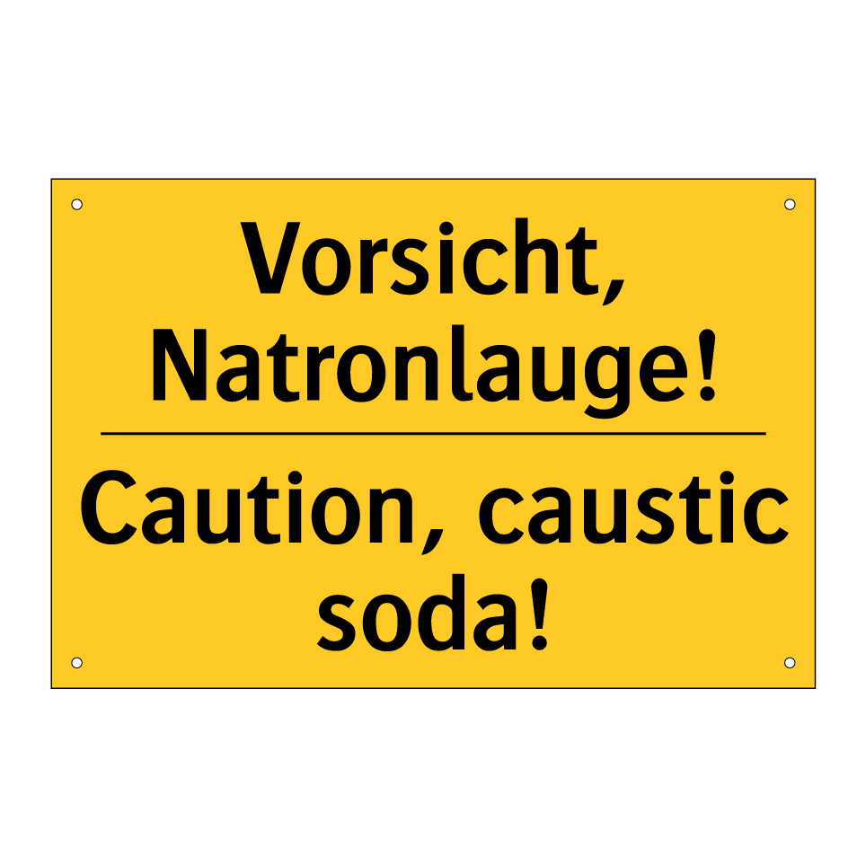 Zweisprachiges Warnschild mit deutschem Text Vorsicht, Natronlauge! und englischem Text Caution, caustic soda!