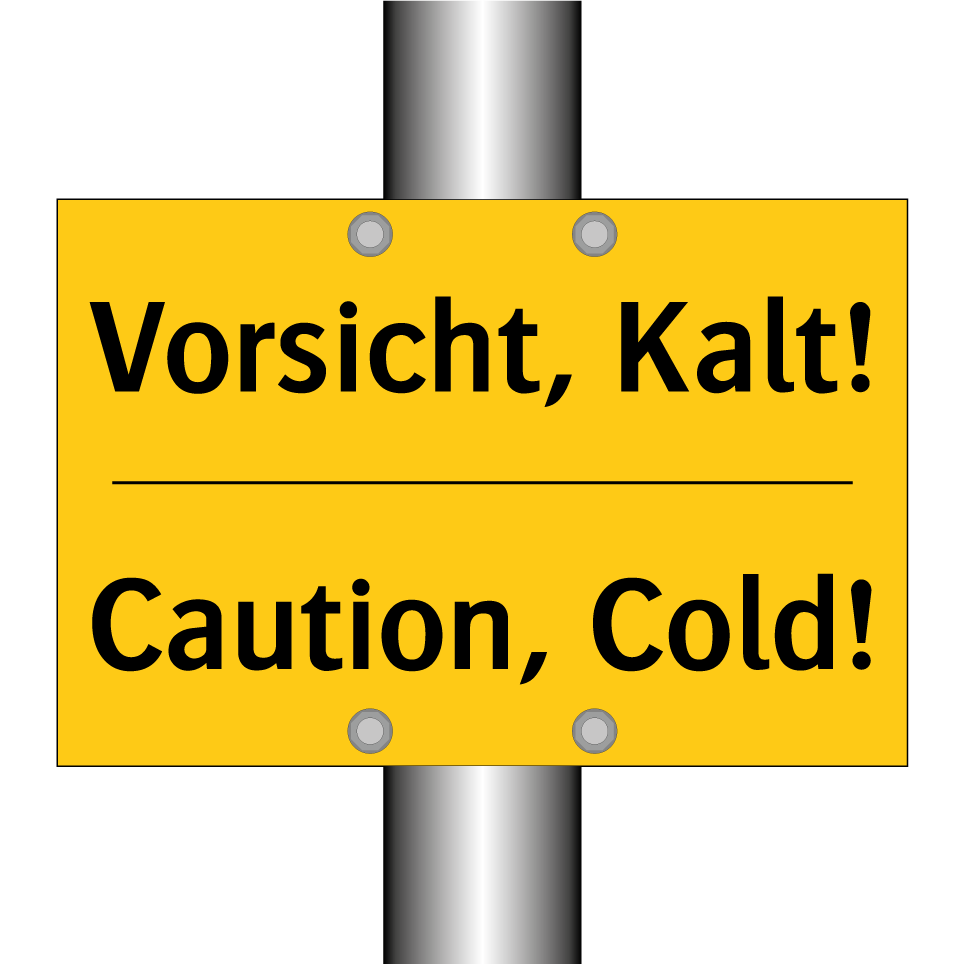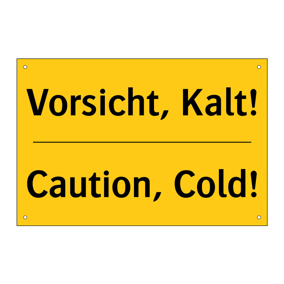 Zweisprachiges Warnschild mit deutschem Text Vorsicht, Kalt! und englischem Text Caution, Cold!