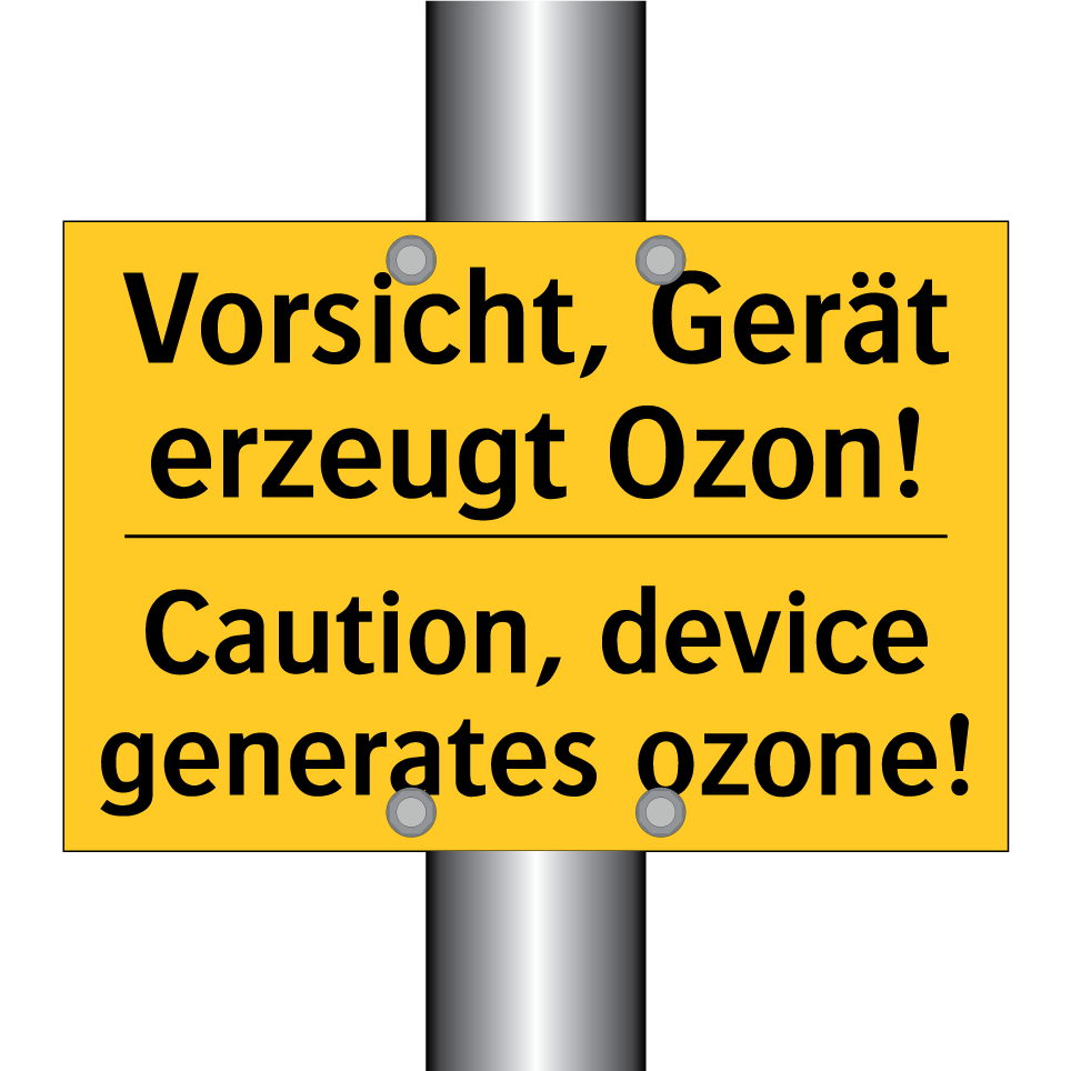 Zweisprachiges Warnschild mit deutschem Text Vorsicht, Gerät erzeugt Ozon! und englischem Text Caution, device generates ozone!