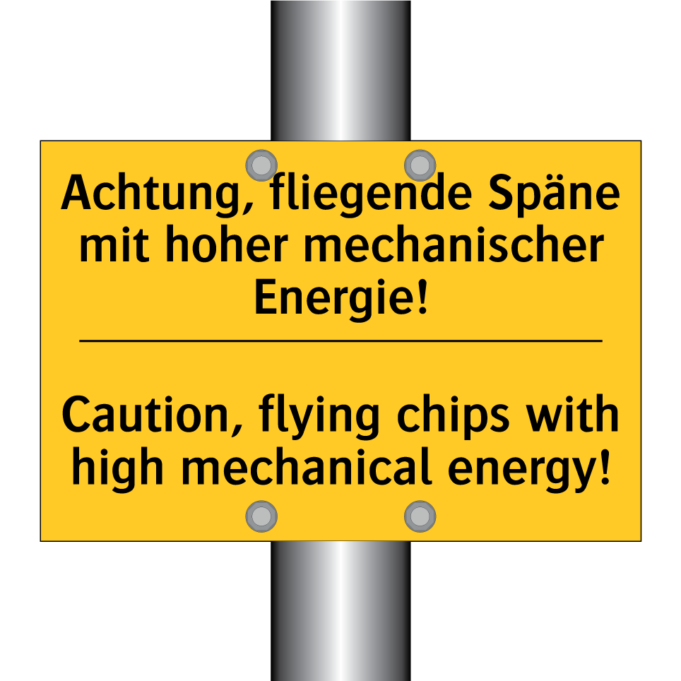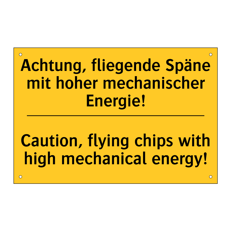 Zweisprachiges Warnschild mit deutschem Text Achtung, fliegende Späne mit hoher mechanischer Energie! und englischem Text Caution, flying chips with high mechanical energy!
