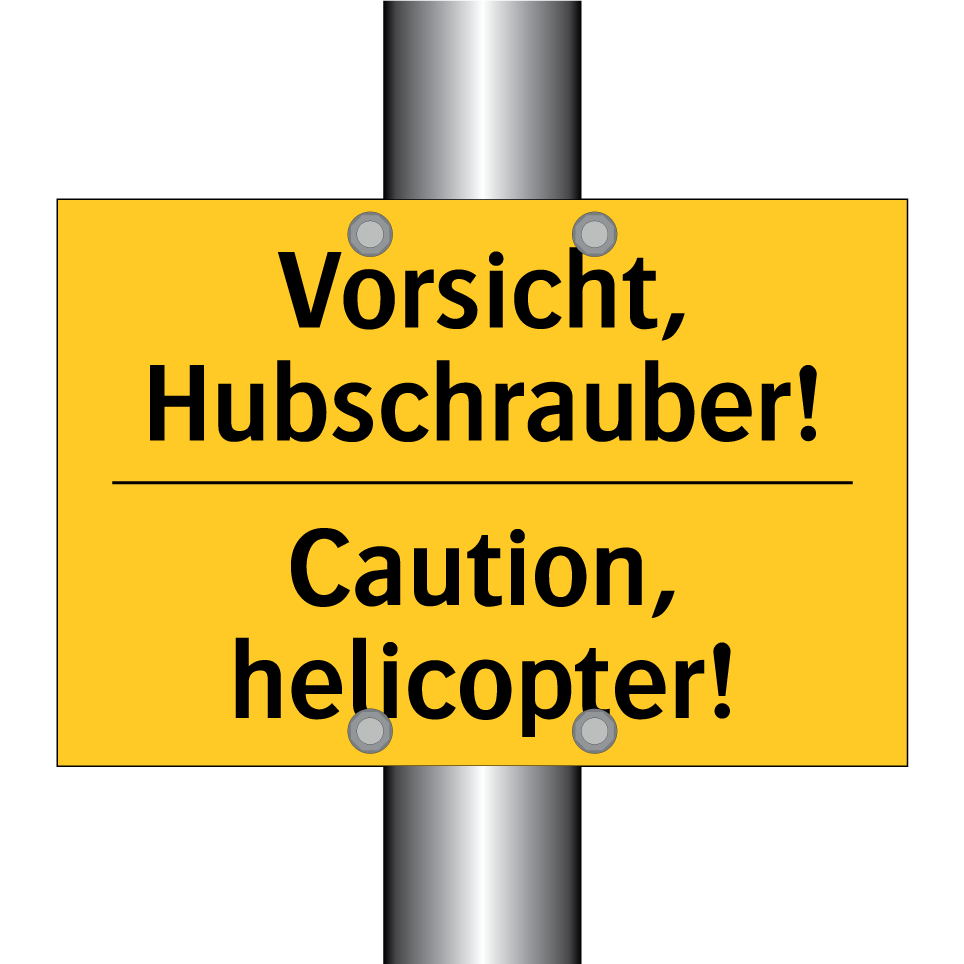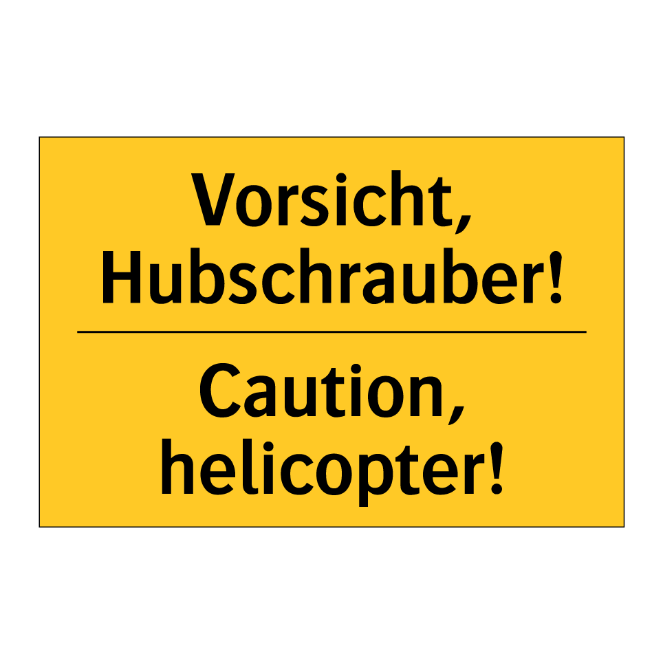 Zweisprachiges Warnschild mit deutschem Text Vorsicht, Hubschrauber! und englischem Text Caution, helicopter!