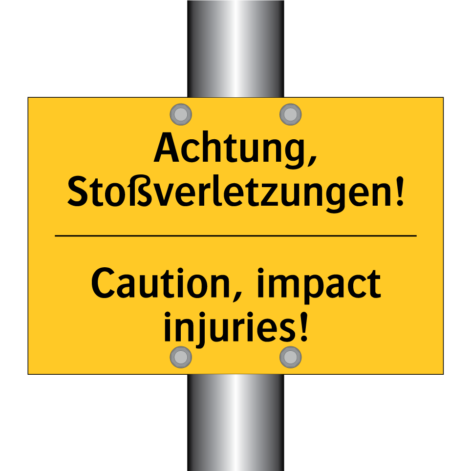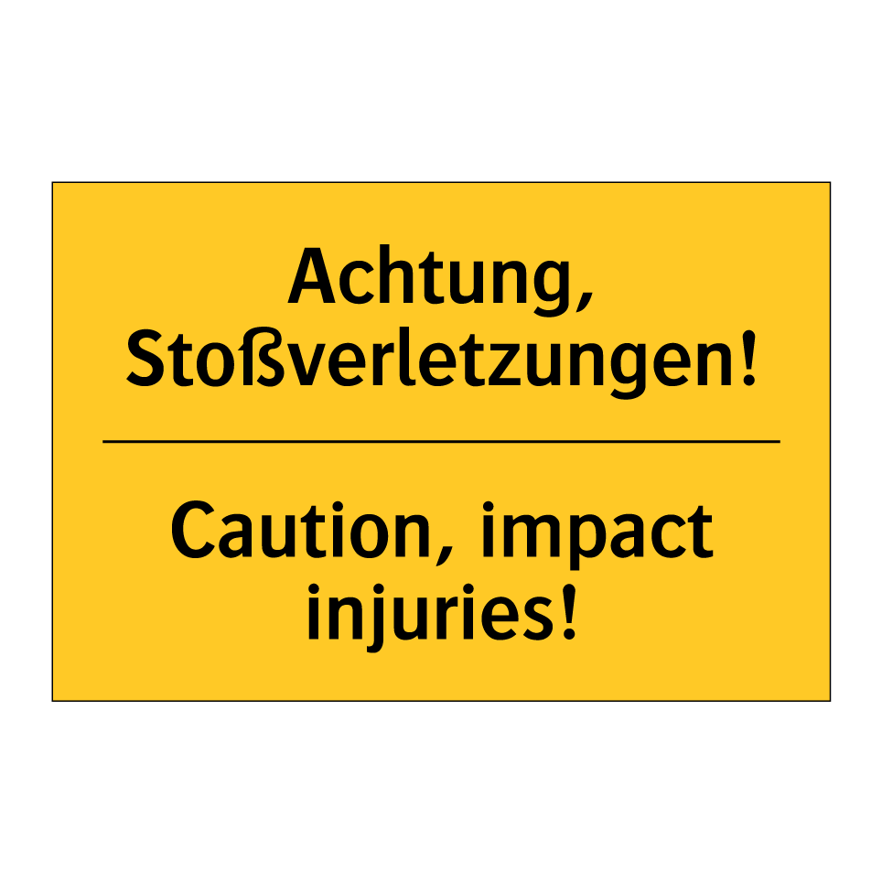 Zweisprachiges Warnschild mit deutschem Text Achtung, Stoßverletzungen! und englischem Text Caution, impact injuries!