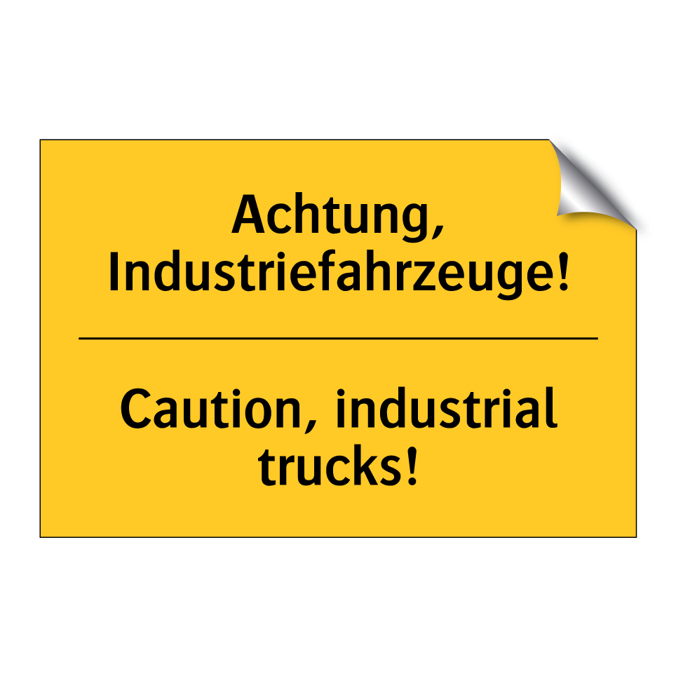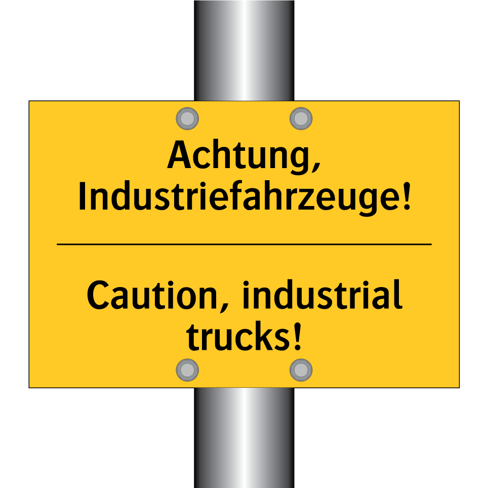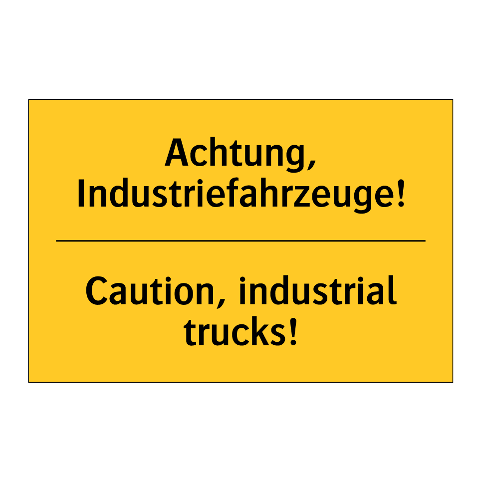 Zweisprachiges Warnschild mit deutschem Text Achtung, Industriefahrzeuge! und englischem Text Caution, industrial trucks!