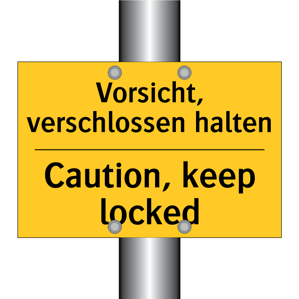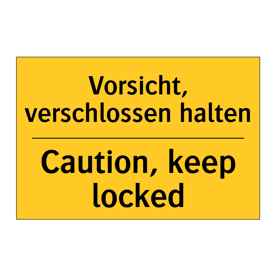Zweisprachiges Warnschild mit deutschem Text Vorsicht, verschlossen halten und englischem Text Caution, keep locked