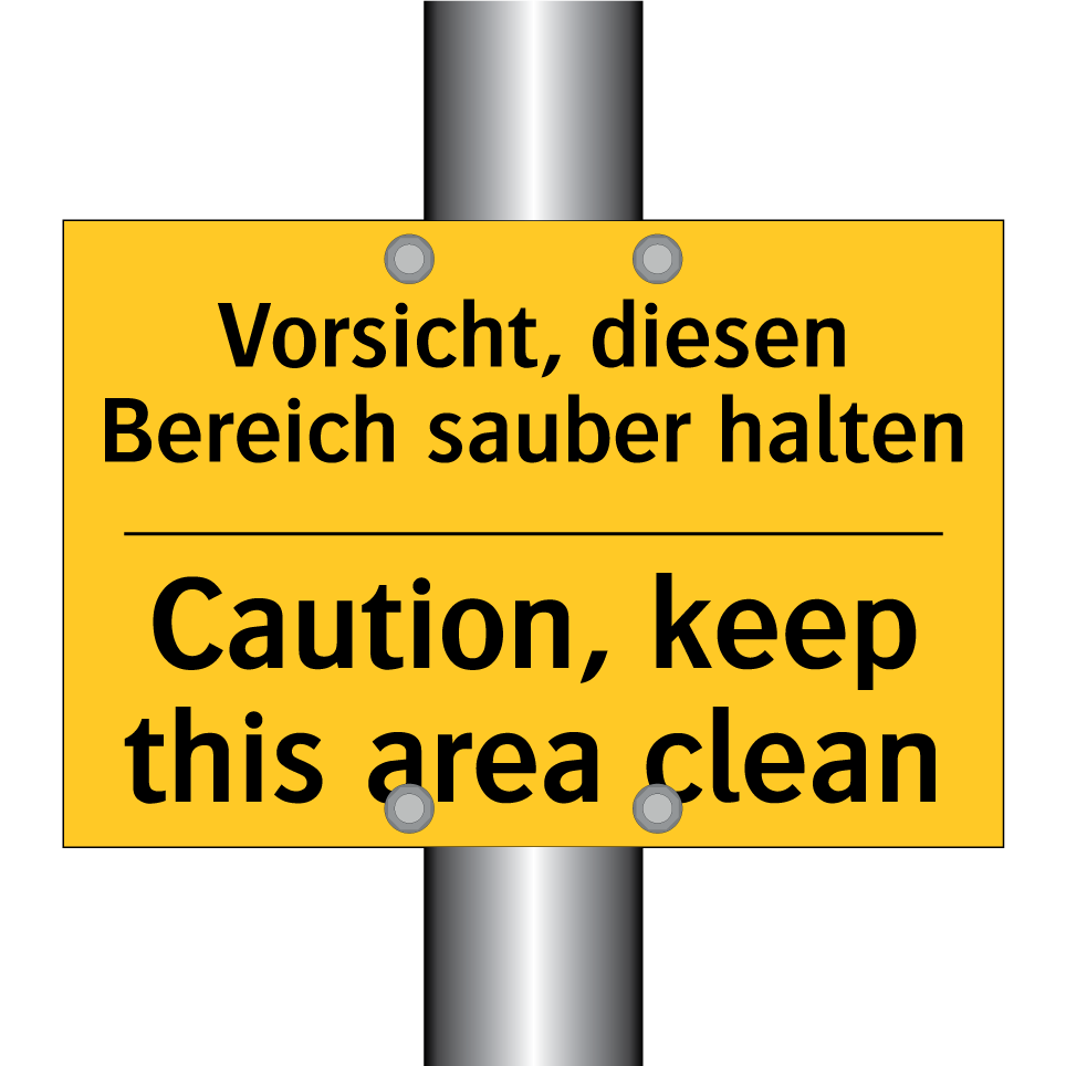 Zweisprachiges Warnschild mit deutschem Text Vorsicht, diesen Bereich sauber halten und englischem Text Caution, keep this area clean