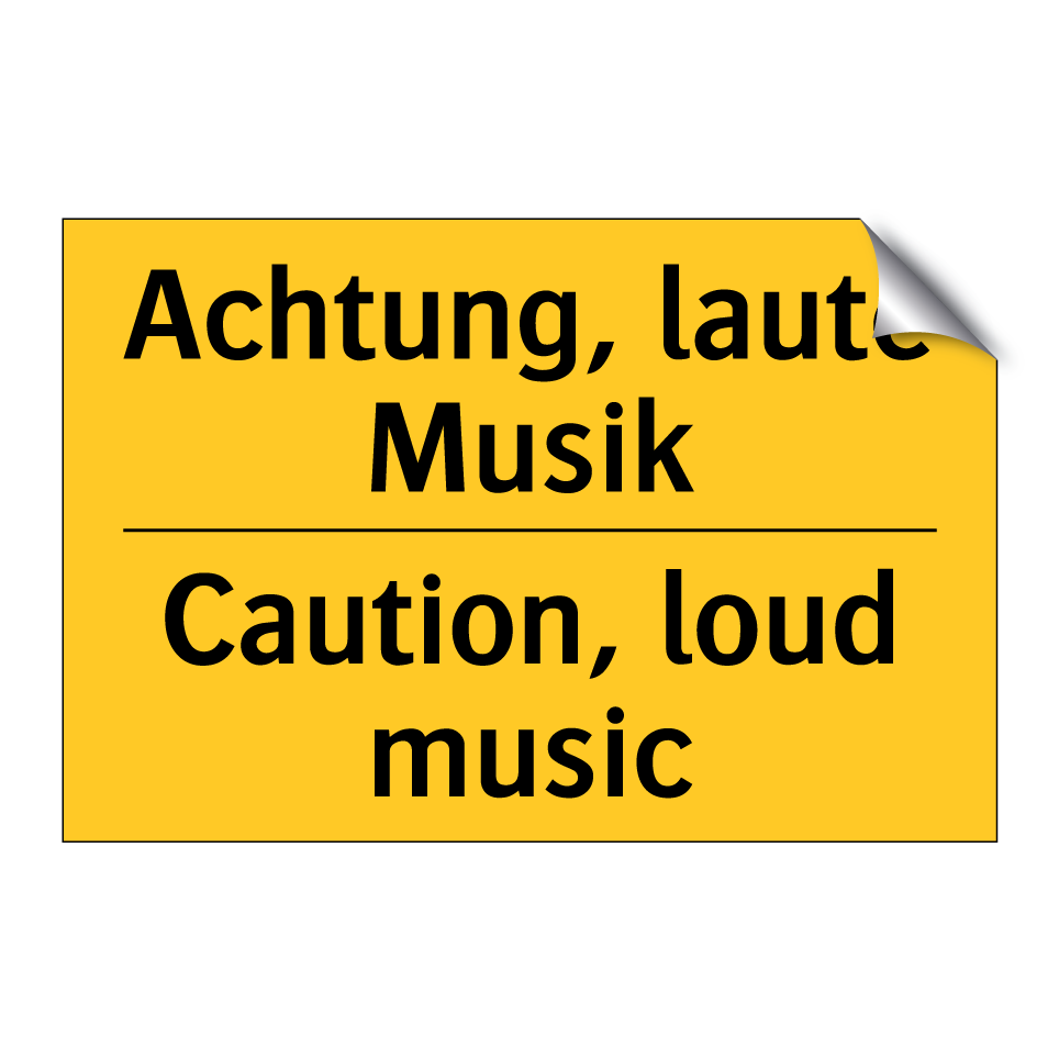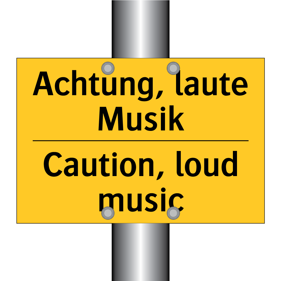 Zweisprachiges Warnschild mit deutschem Text Achtung, laute Musik und englischem Text Caution, loud music