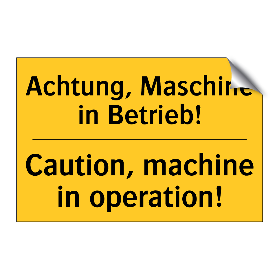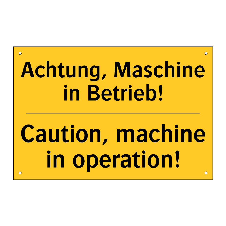 Zweisprachiges Warnschild mit deutschem Text Achtung, Maschine in Betrieb! und englischem Text Caution, machine in operation!
