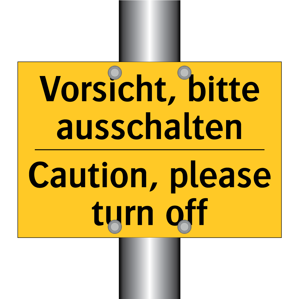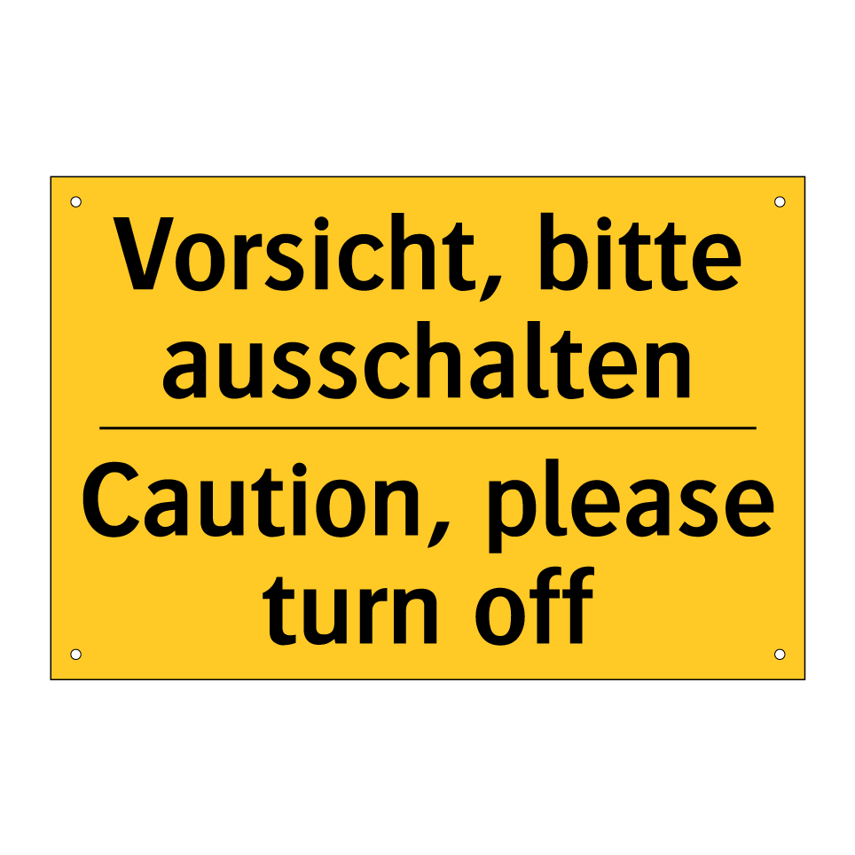 Zweisprachiges Warnschild mit deutschem Text Vorsicht, bitte ausschalten und englischem Text Caution, please turn off
