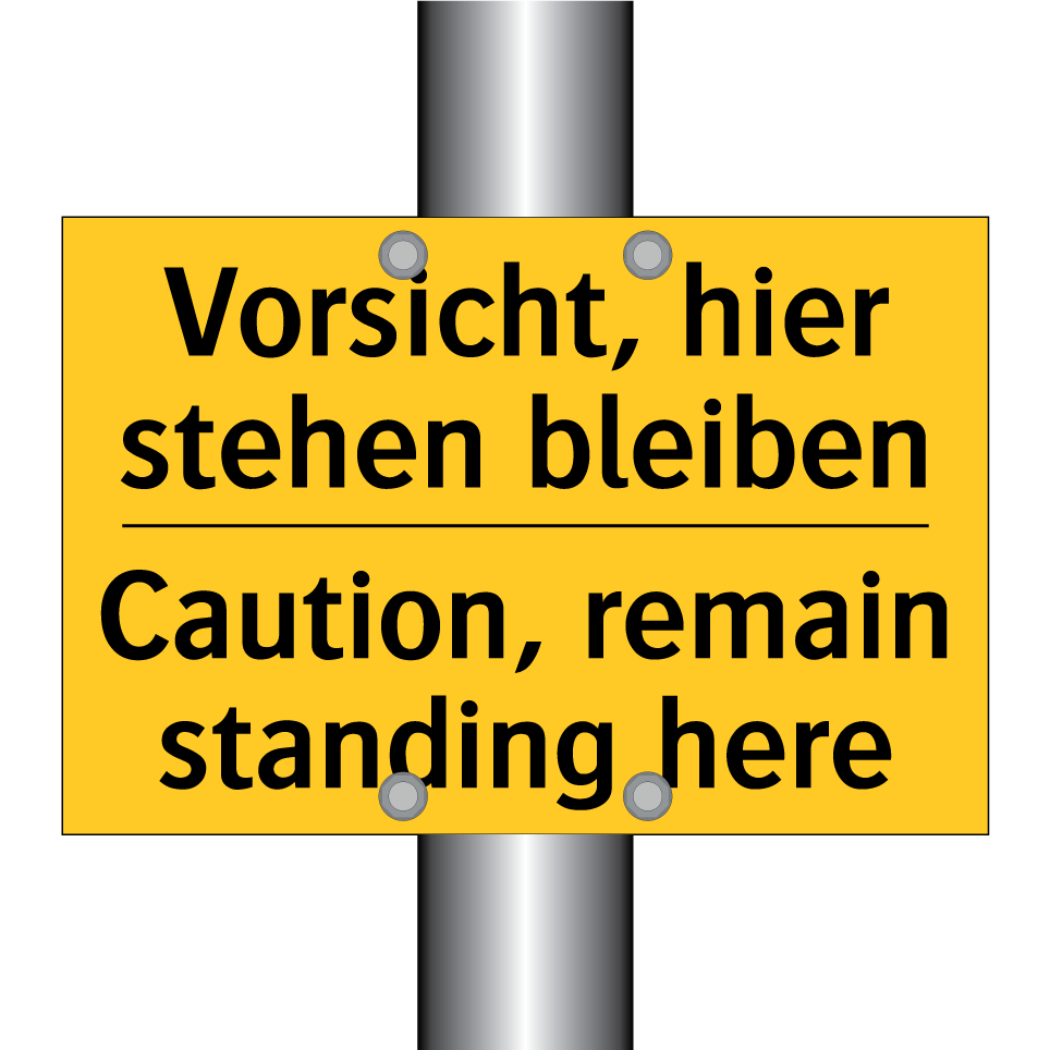 Zweisprachiges Warnschild mit deutschem Text Vorsicht, hier stehen bleiben und englischem Text Caution, remain standing here