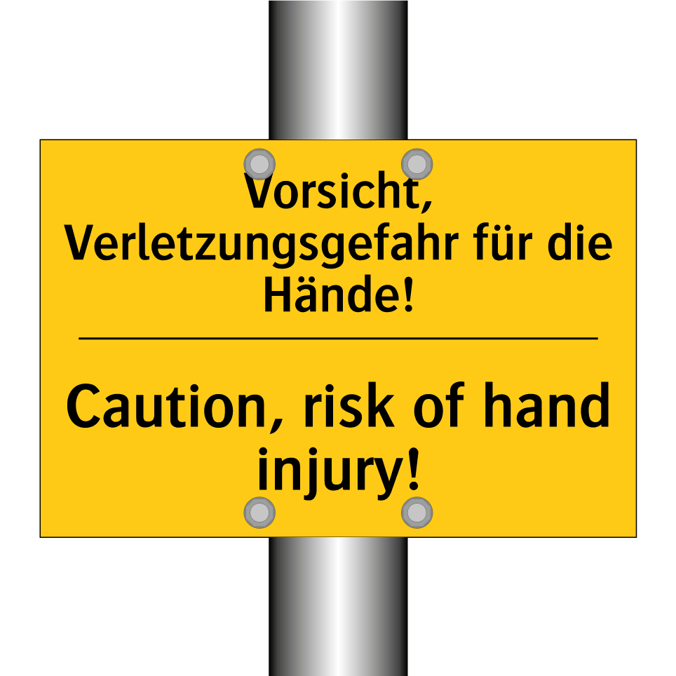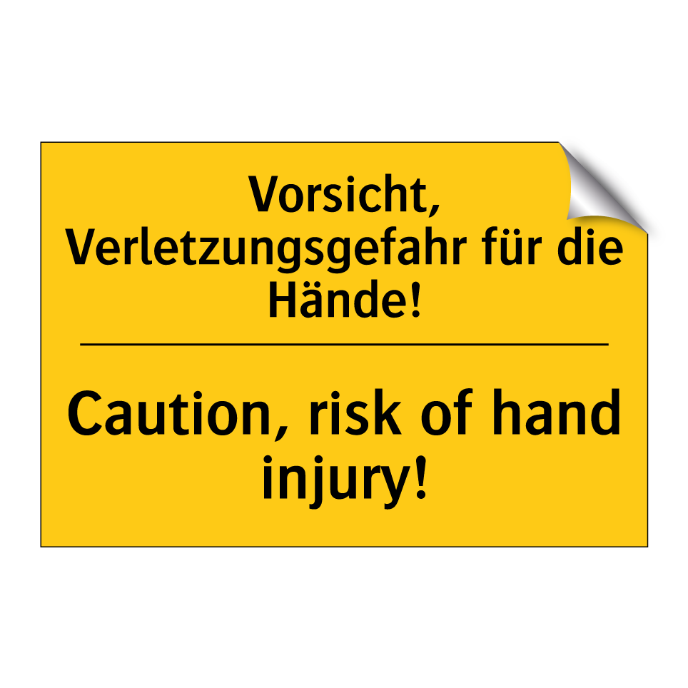 Zweisprachiges Warnschild mit deutschem Text Vorsicht, Verletzungsgefahr für die Hände! und englischem Text Caution, risk of hand injury!
