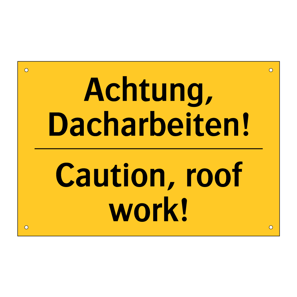 Zweisprachiges Warnschild mit deutschem Text Achtung, Dacharbeiten! und englischem Text Caution, roof work!