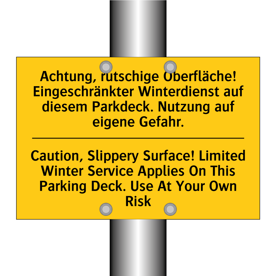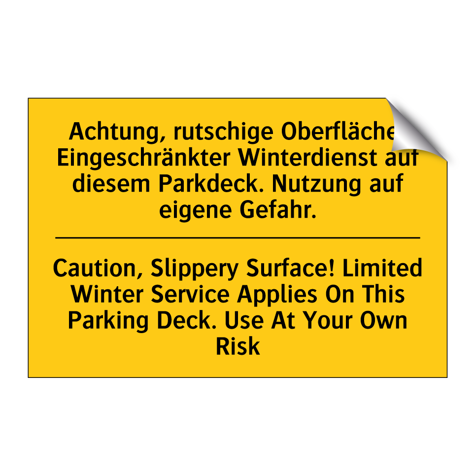 Zweisprachiges Warnschild mit deutschem Text Achtung, rutschige Oberfläche! Eingeschränkter Winterdienst auf diesem Parkdeck. Nutzung auf eigene Gefahr. und englischem Text Caution, Slippery Surface! Limited Winter Service Applies On This Parking Deck. Use At Your Own Risk