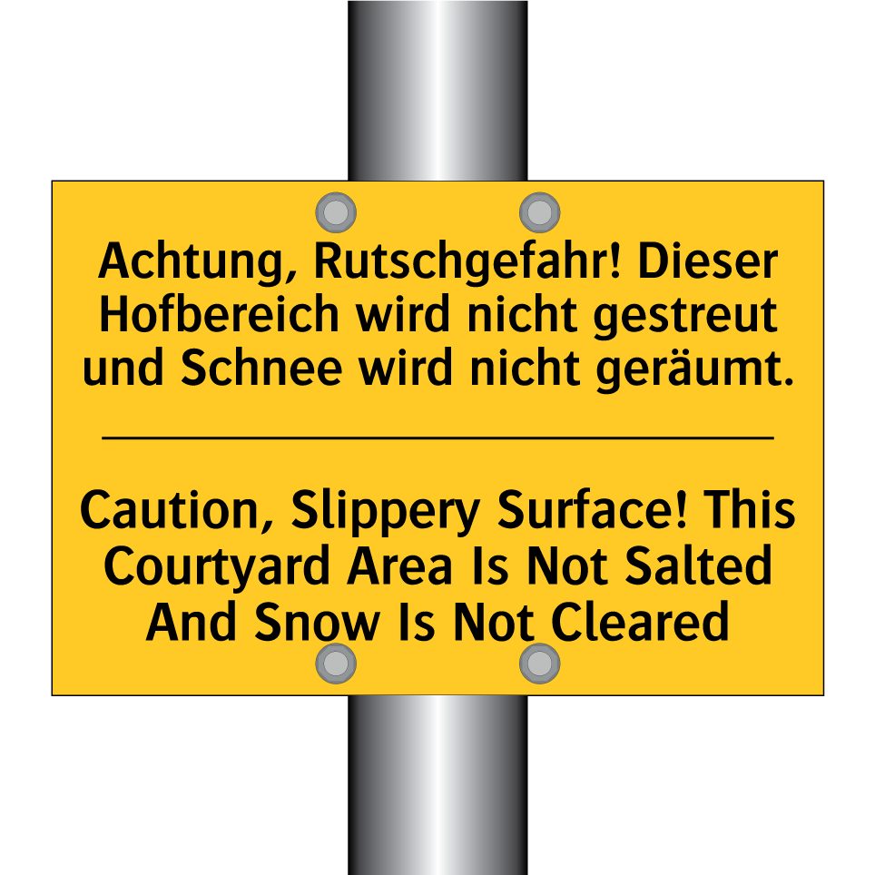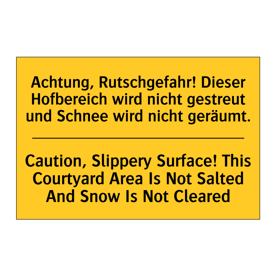 Zweisprachiges Warnschild mit deutschem Text Achtung, Rutschgefahr! Dieser Hofbereich wird nicht gestreut und Schnee wird nicht geräumt. und englischem Text Caution, Slippery Surface! This Courtyard Area Is Not Salted And Snow Is Not Cleared