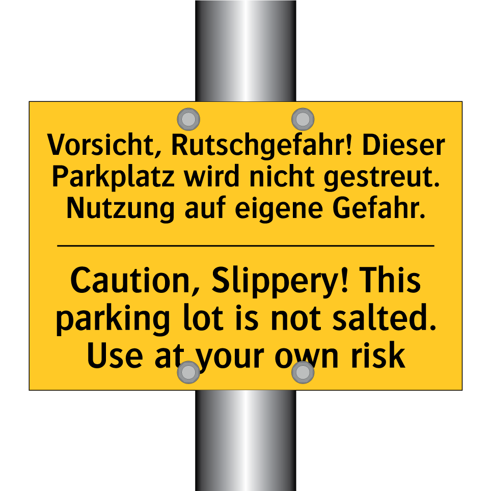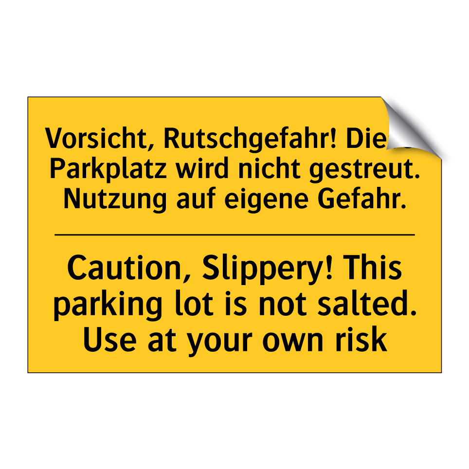 Zweisprachiges Warnschild mit deutschem Text Vorsicht, Rutschgefahr! Dieser Parkplatz wird nicht gestreut. Nutzung auf eigene Gefahr. und englischem Text Caution, Slippery! This parking lot is not salted. Use at your own risk