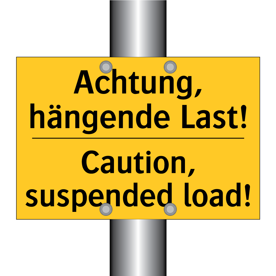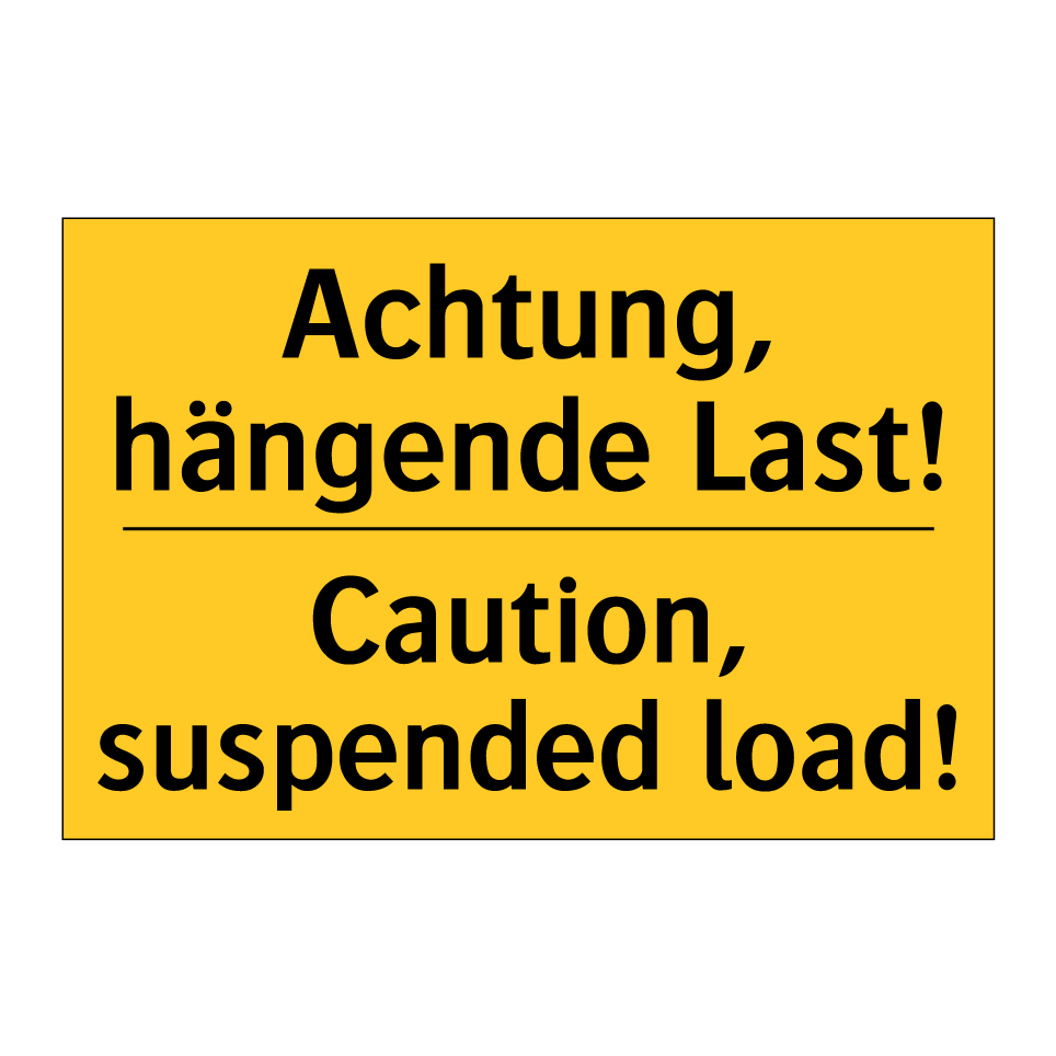 Zweisprachiges Warnschild mit deutschem Text Achtung, hängende Last! und englischem Text Caution, suspended load!
