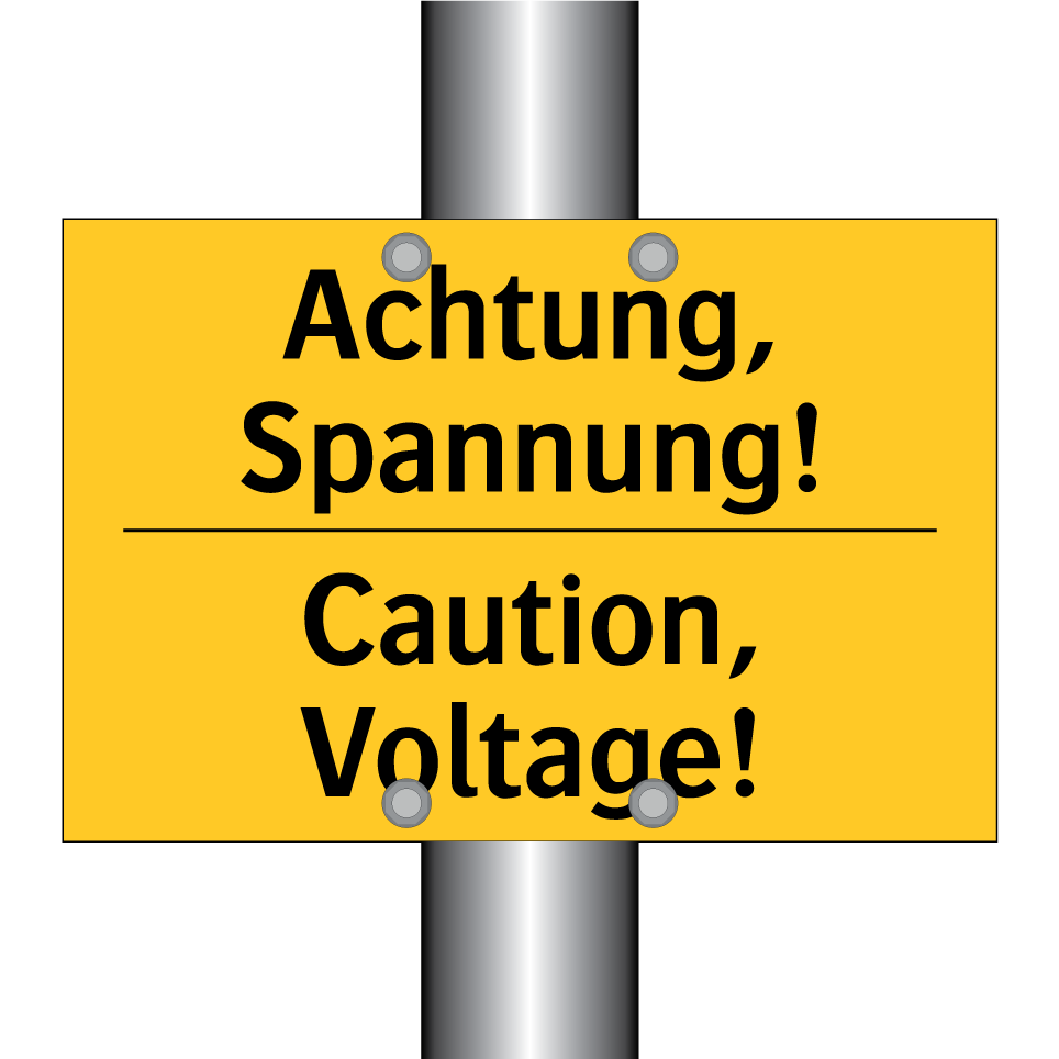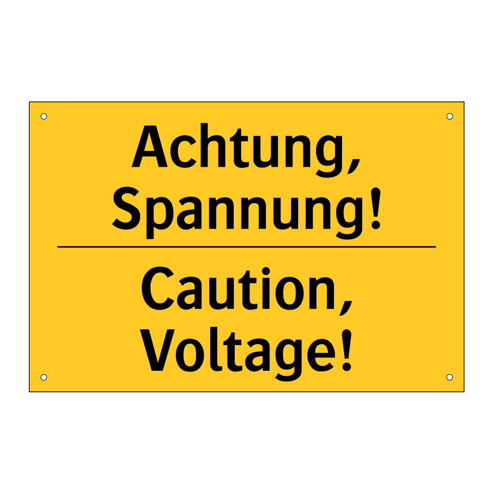 Zweisprachiges Warnschild mit deutschem Text Achtung, Spannung! und englischem Text Caution, Voltage!