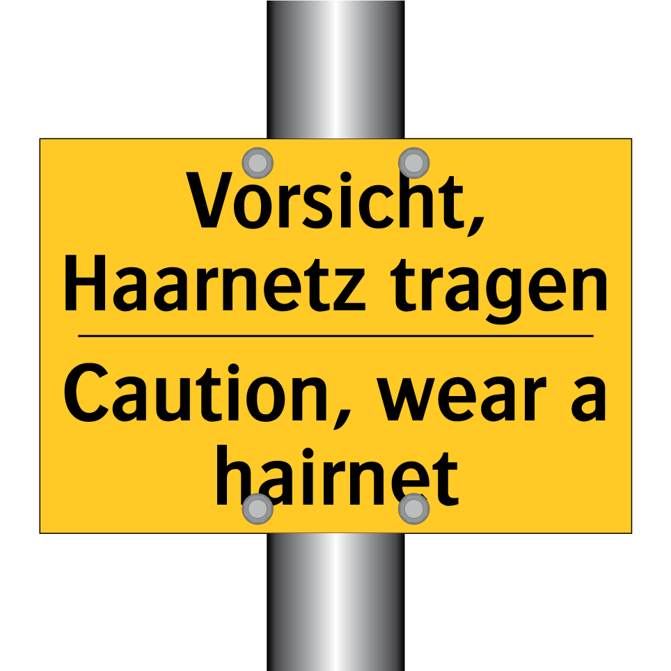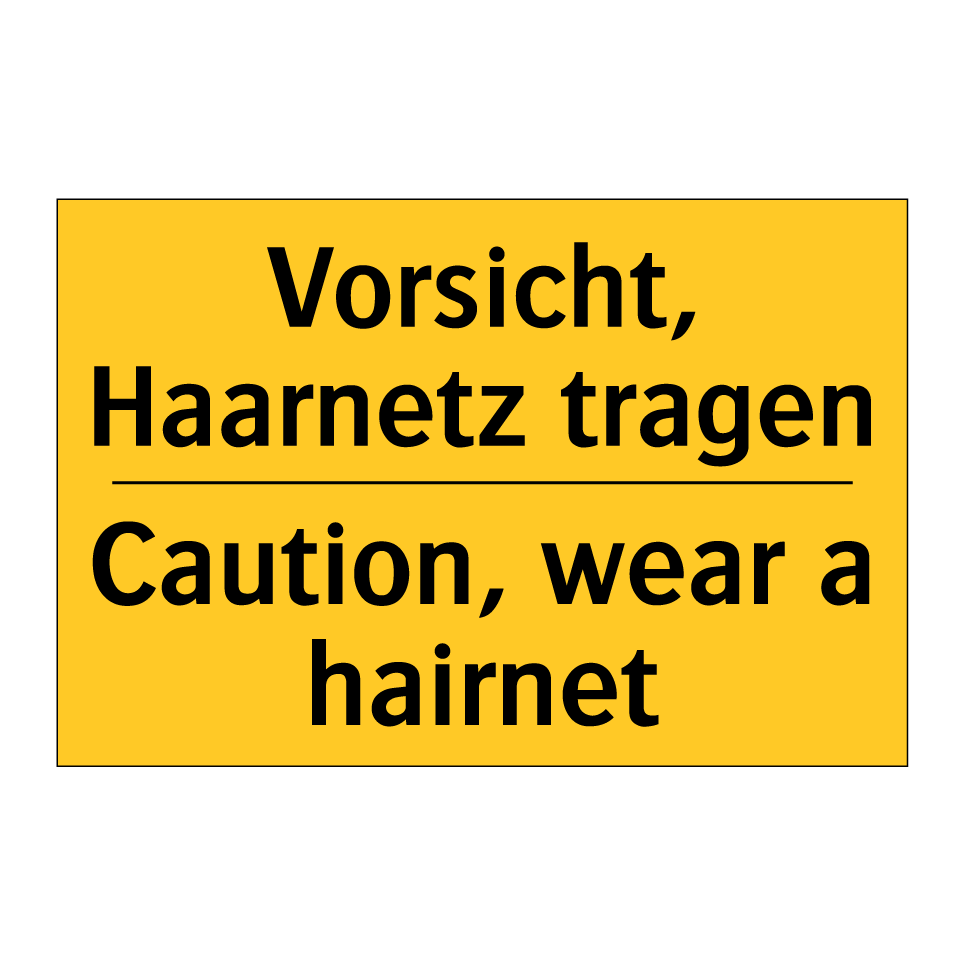 Zweisprachiges Warnschild mit deutschem Text Vorsicht, Haarnetz tragen und englischem Text Caution, wear a hairnet