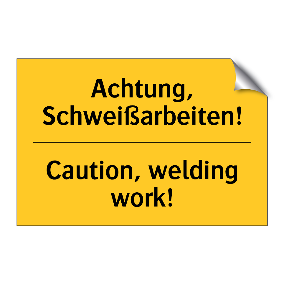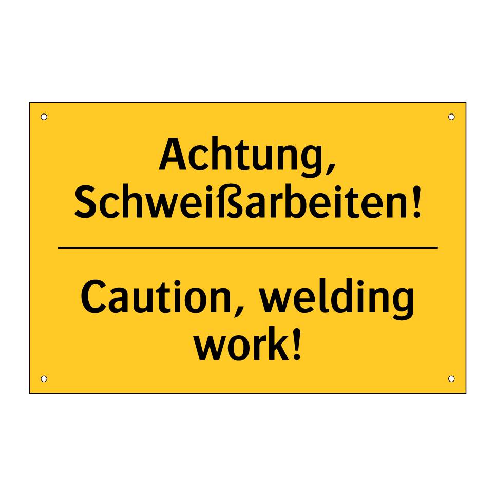 Zweisprachiges Warnschild mit deutschem Text Achtung, Schweißarbeiten! und englischem Text Caution, welding work!