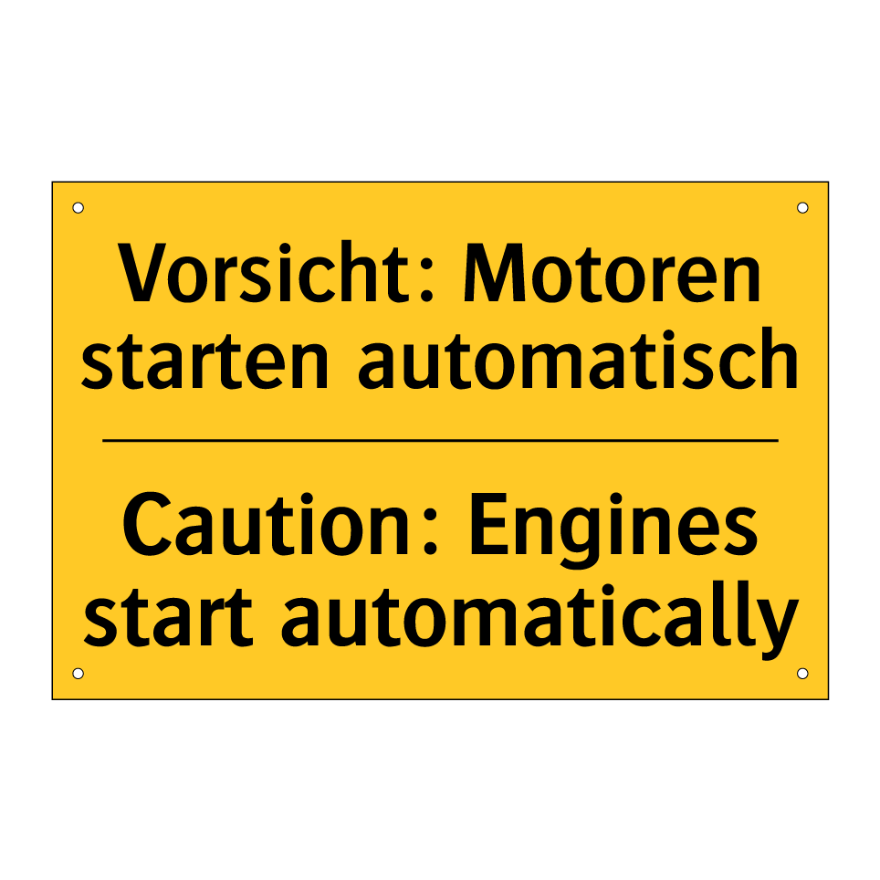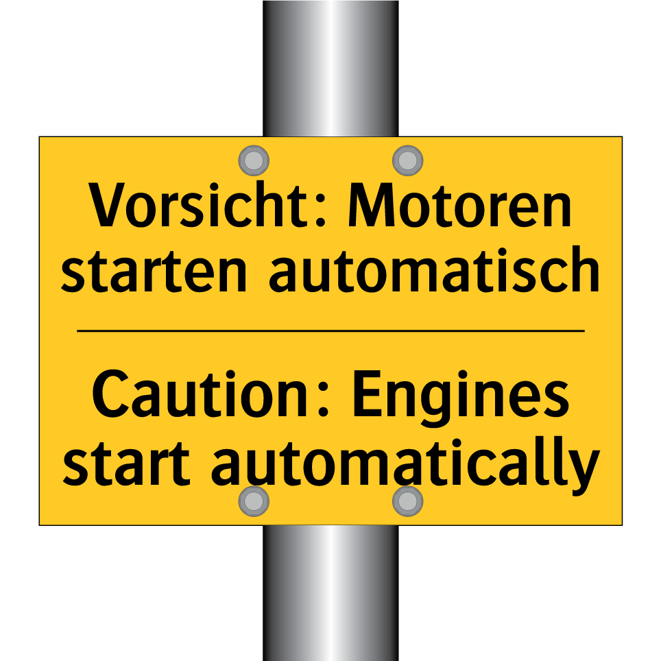 Zweisprachiges Warnschild mit deutschem Text Vorsicht: Motoren starten automatisch und englischem Text Caution: Engines start automatically