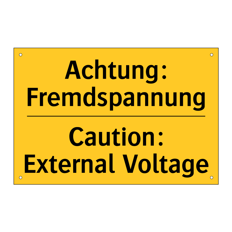 Zweisprachiges Warnschild mit deutschem Text Achtung: Fremdspannung und englischem Text Caution: External Voltage