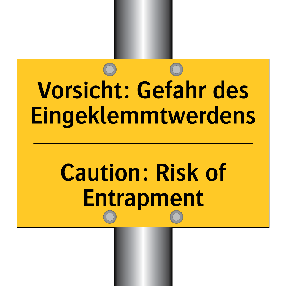 Zweisprachiges Warnschild mit deutschem Text Vorsicht: Gefahr des Eingeklemmtwerdens und englischem Text Caution: Risk of Entrapment
