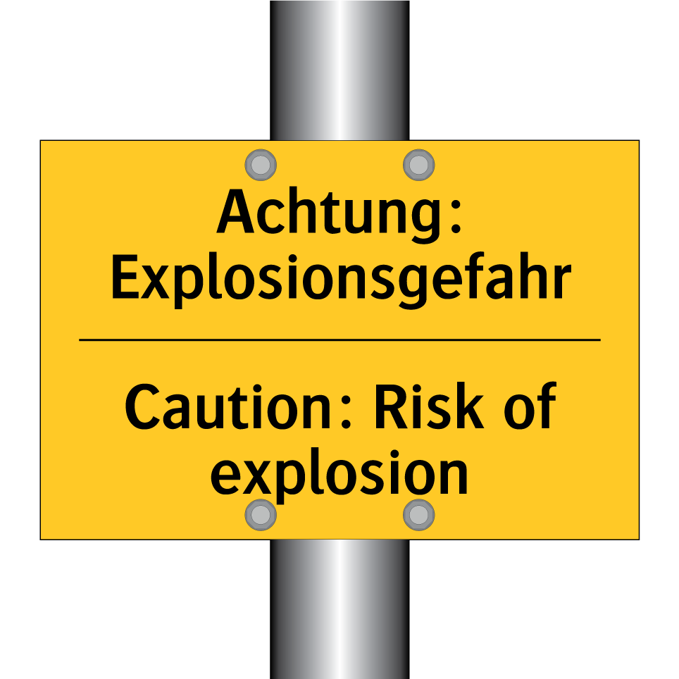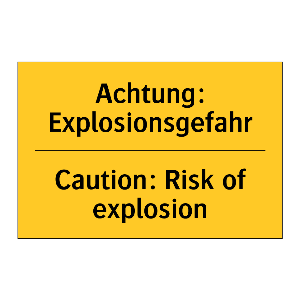 Zweisprachiges Warnschild mit deutschem Text Achtung: Explosionsgefahr und englischem Text Caution: Risk of explosion