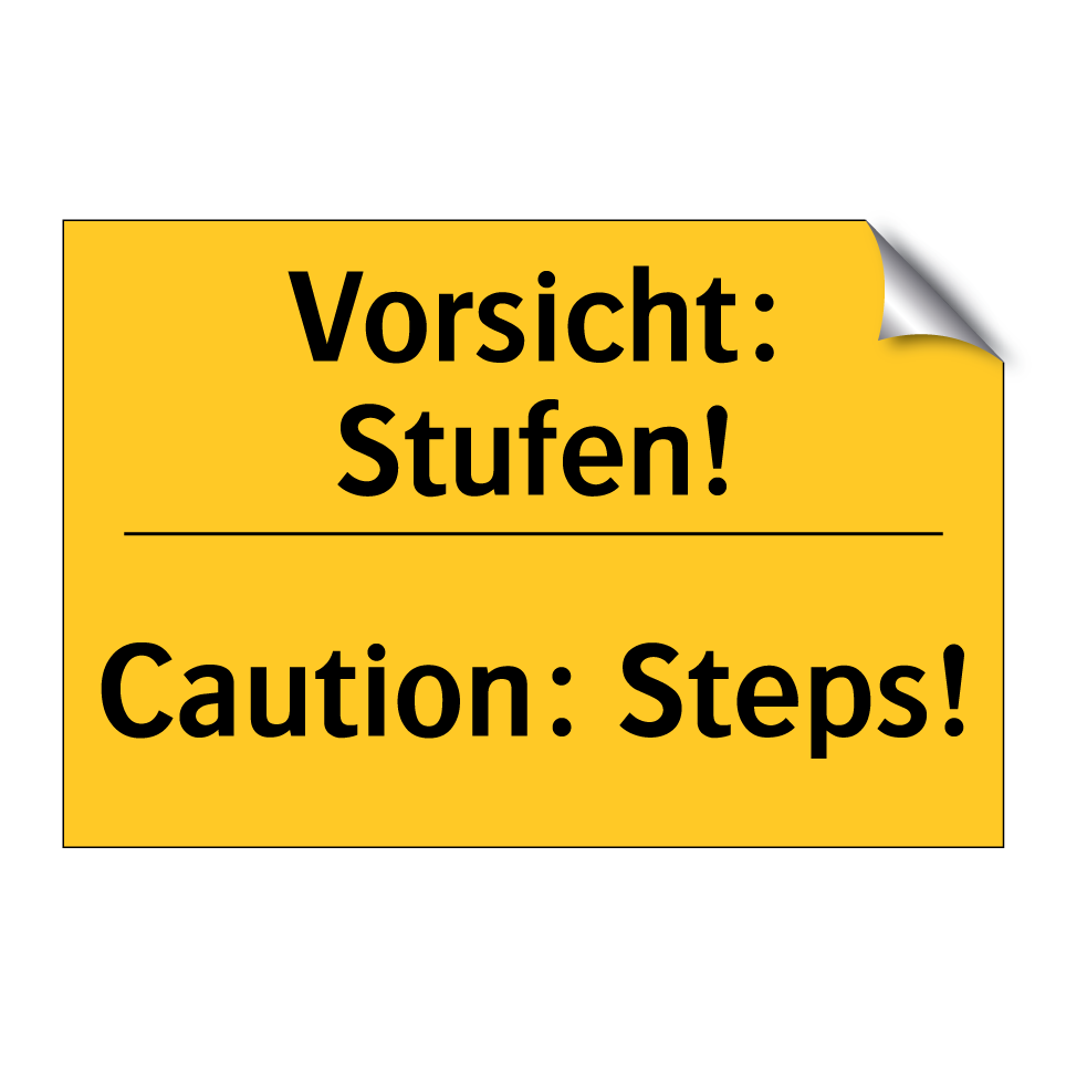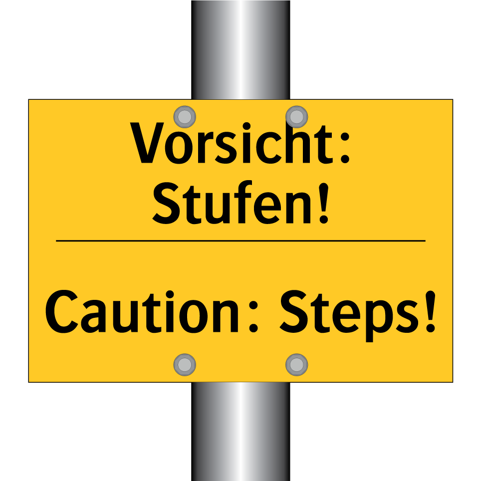 Zweisprachiges Warnschild mit deutschem Text Vorsicht: Stufen! und englischem Text Caution: Steps!