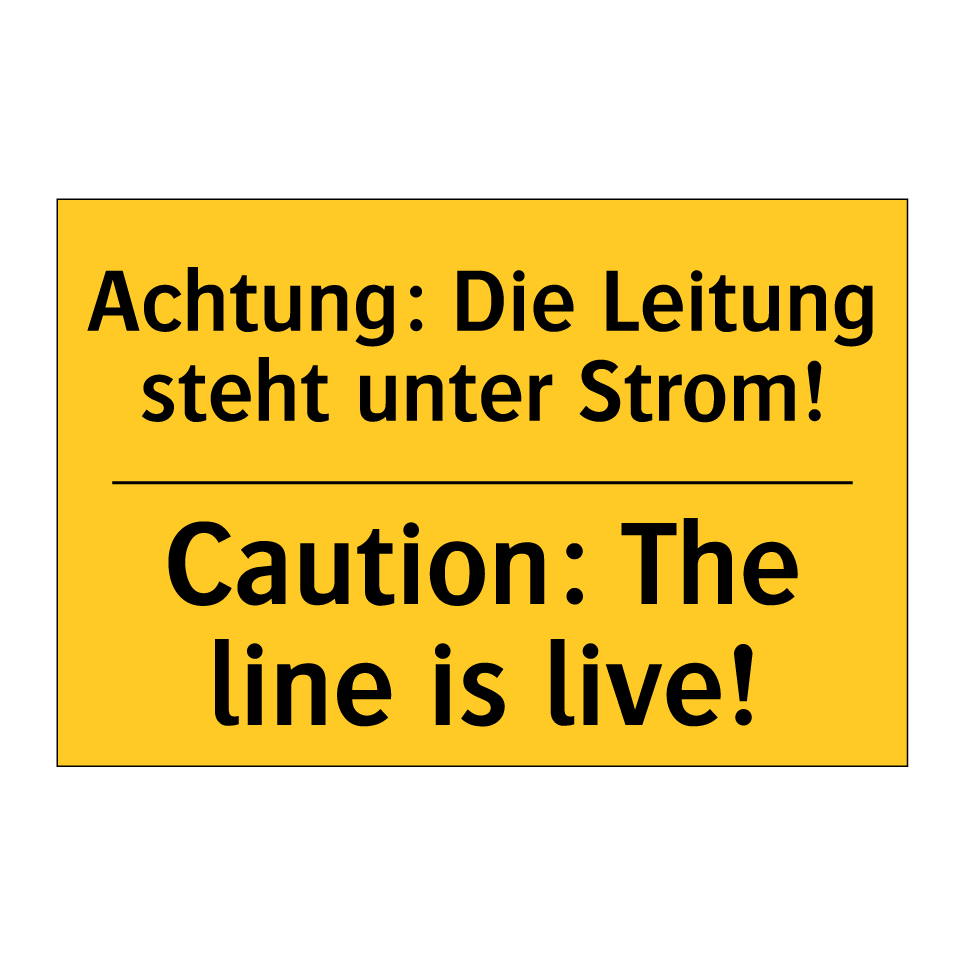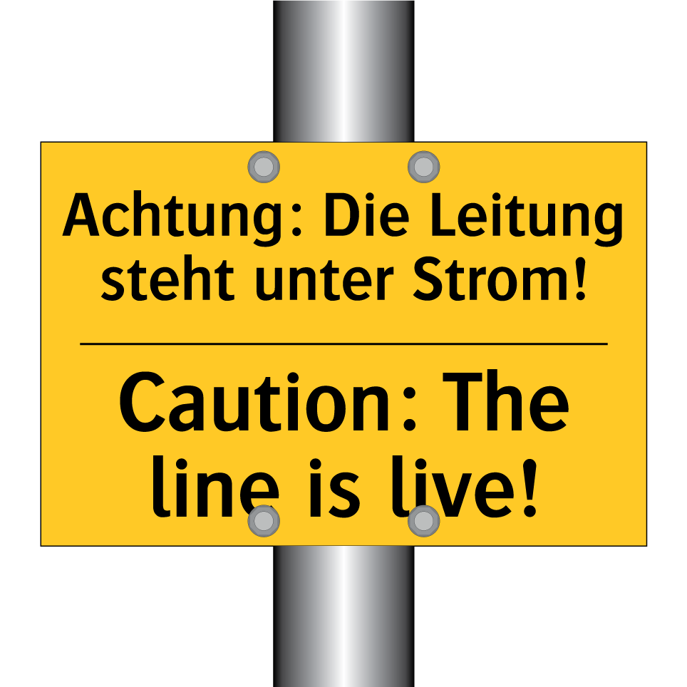 Zweisprachiges Warnschild mit deutschem Text Achtung: Die Leitung steht unter Strom! und englischem Text Caution: The line is live!