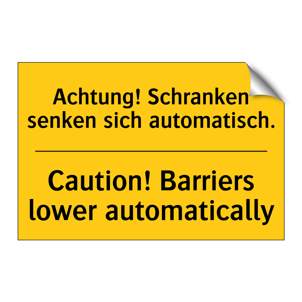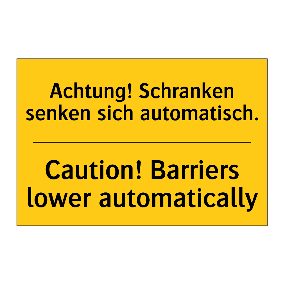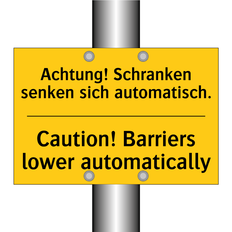 Zweisprachiges Warnschild mit deutschem Text Achtung! Schranken senken sich automatisch. und englischem Text Caution! Barriers lower automatically