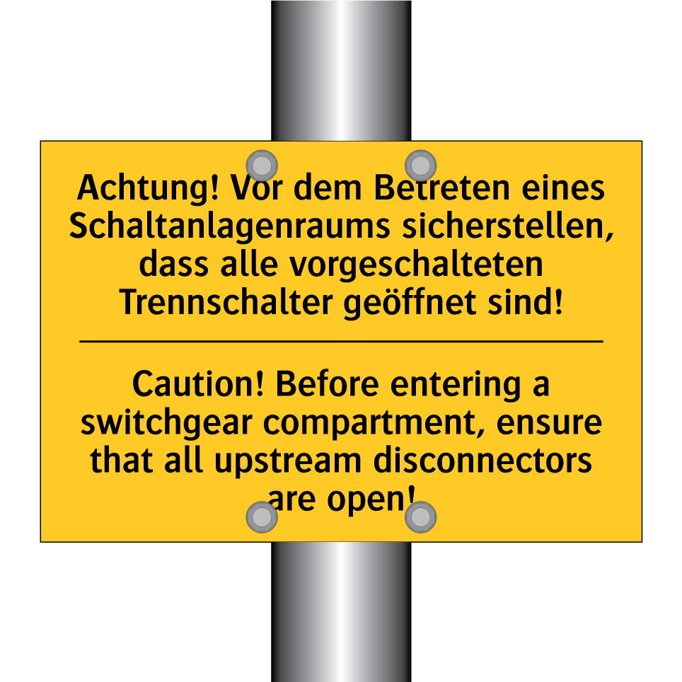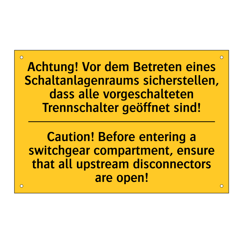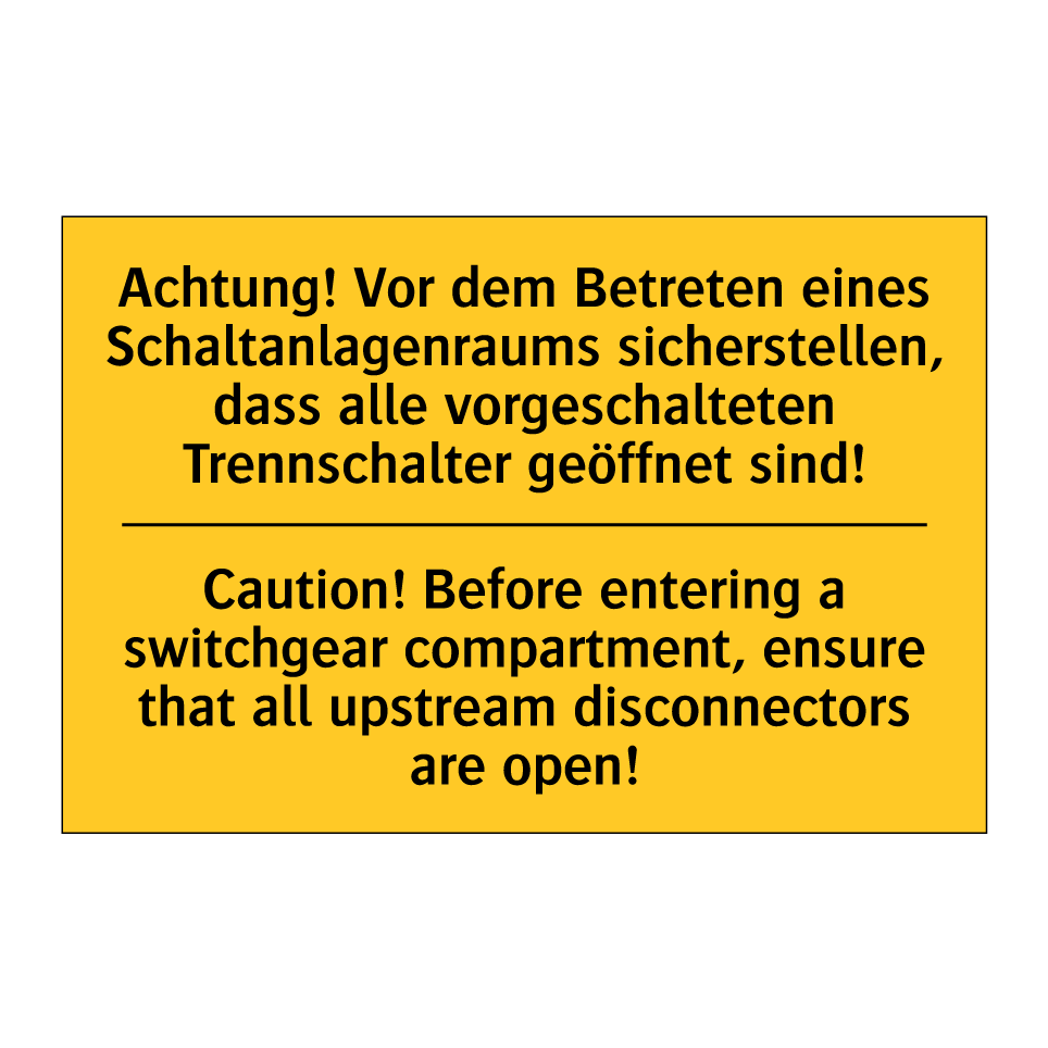 Zweisprachiges Warnschild mit deutschem Text Achtung! Vor dem Betreten eines Schaltanlagenraums sicherstellen, dass alle vorgeschalteten Trennschalter geöffnet sind! und englischem Text Caution! Before entering a switchgear compartment, ensure that all upstream disconnectors are open!