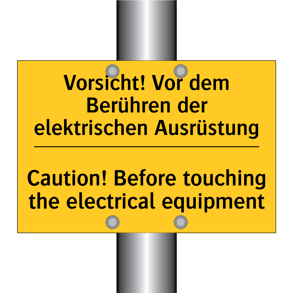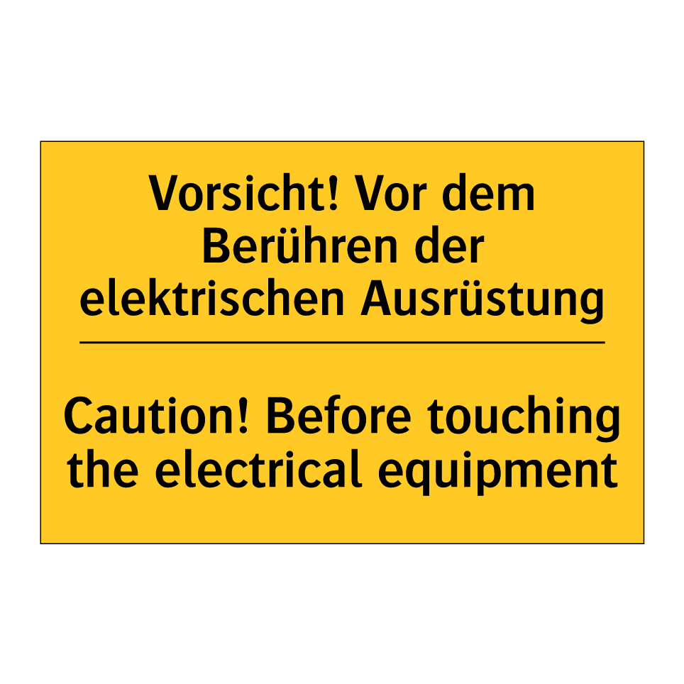 Zweisprachiges Warnschild mit deutschem Text Vorsicht! Vor dem Berühren der elektrischen Ausrüstung und englischem Text Caution! Before touching the electrical equipment