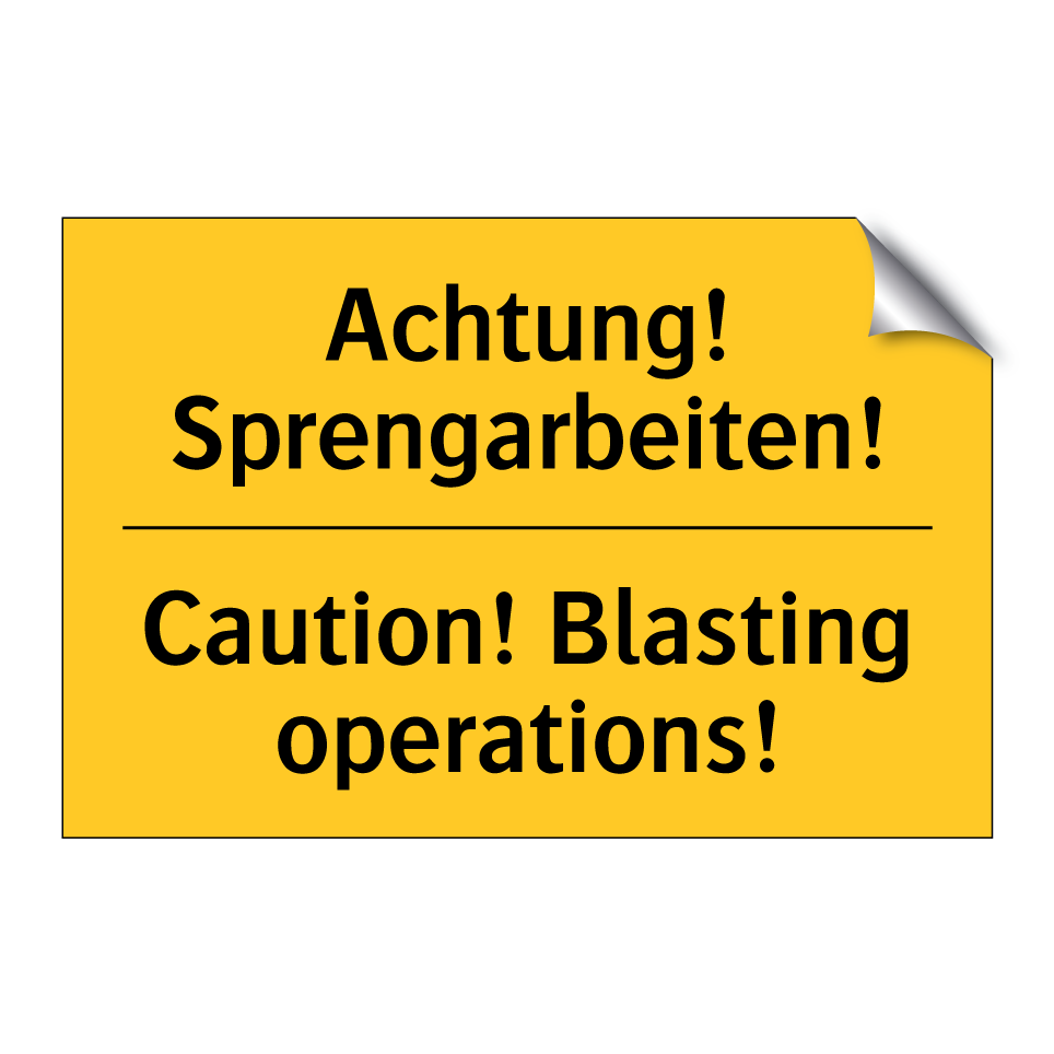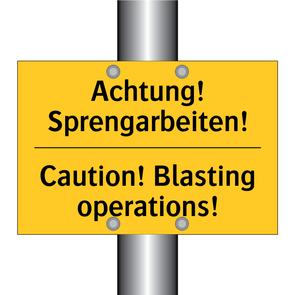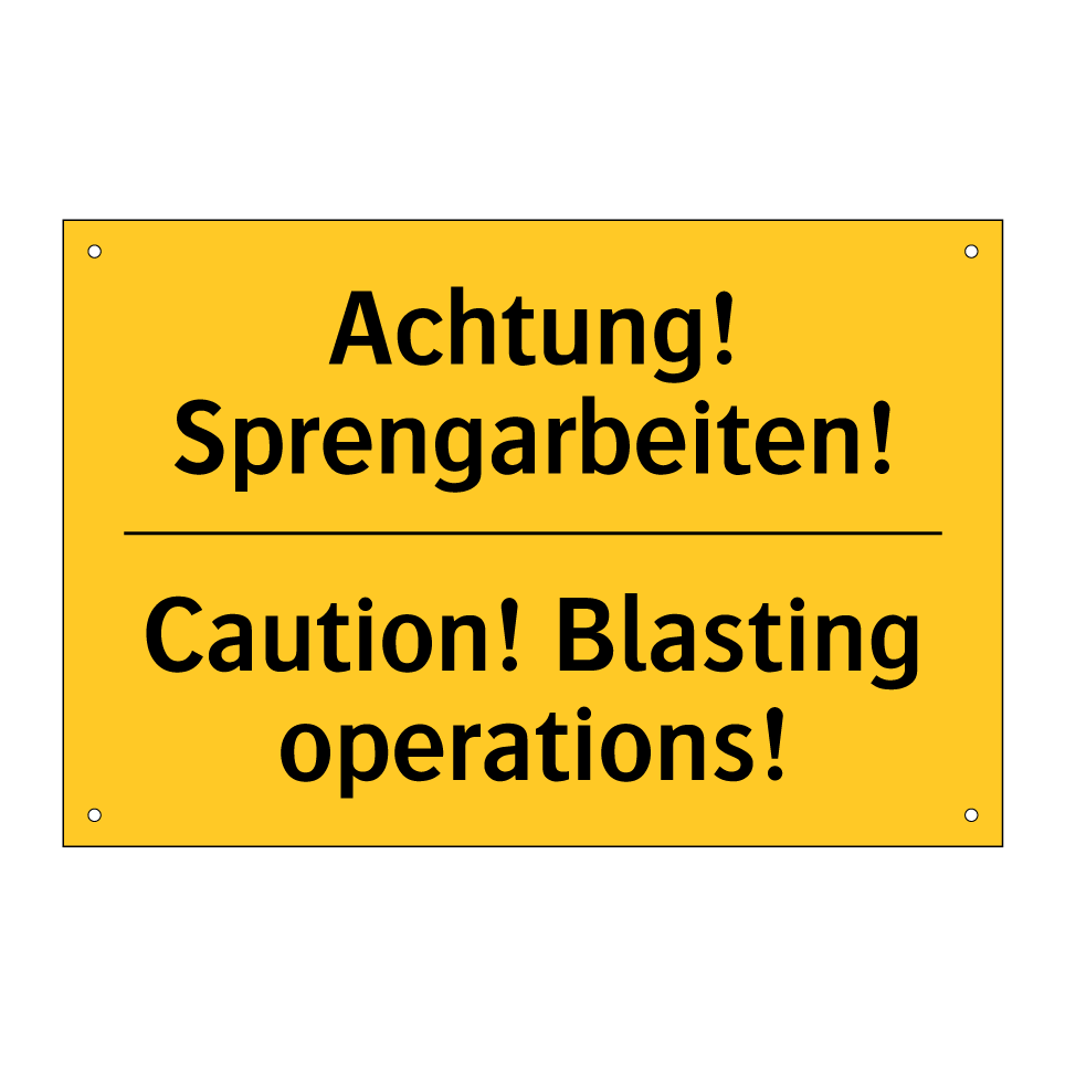 Zweisprachiges Warnschild mit deutschem Text Achtung! Sprengarbeiten! und englischem Text Caution! Blasting operations!