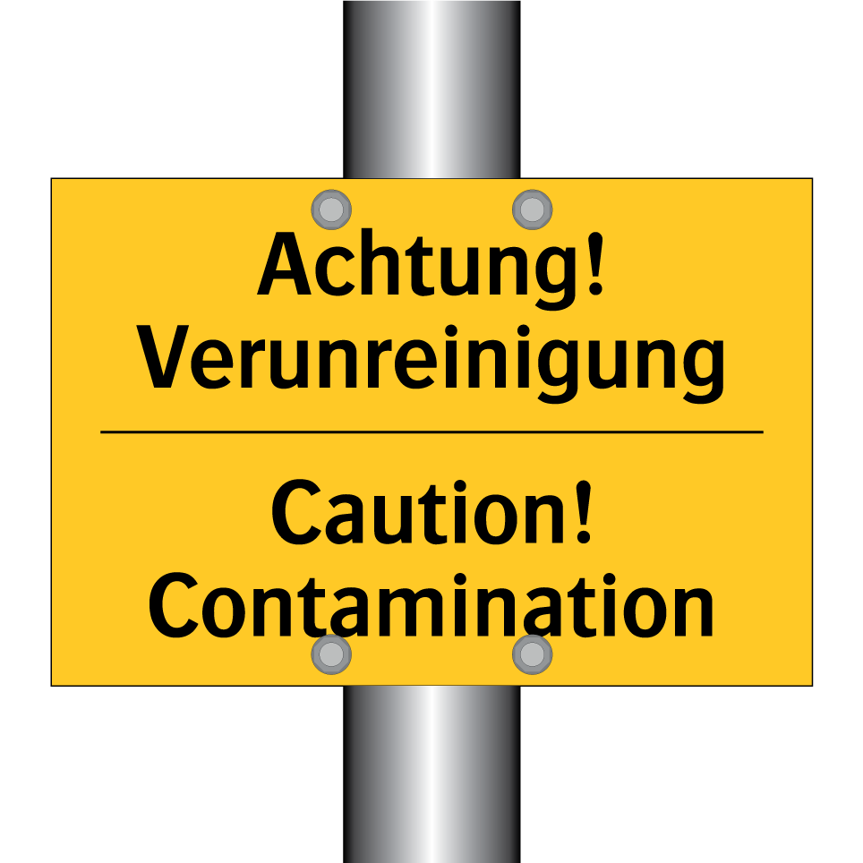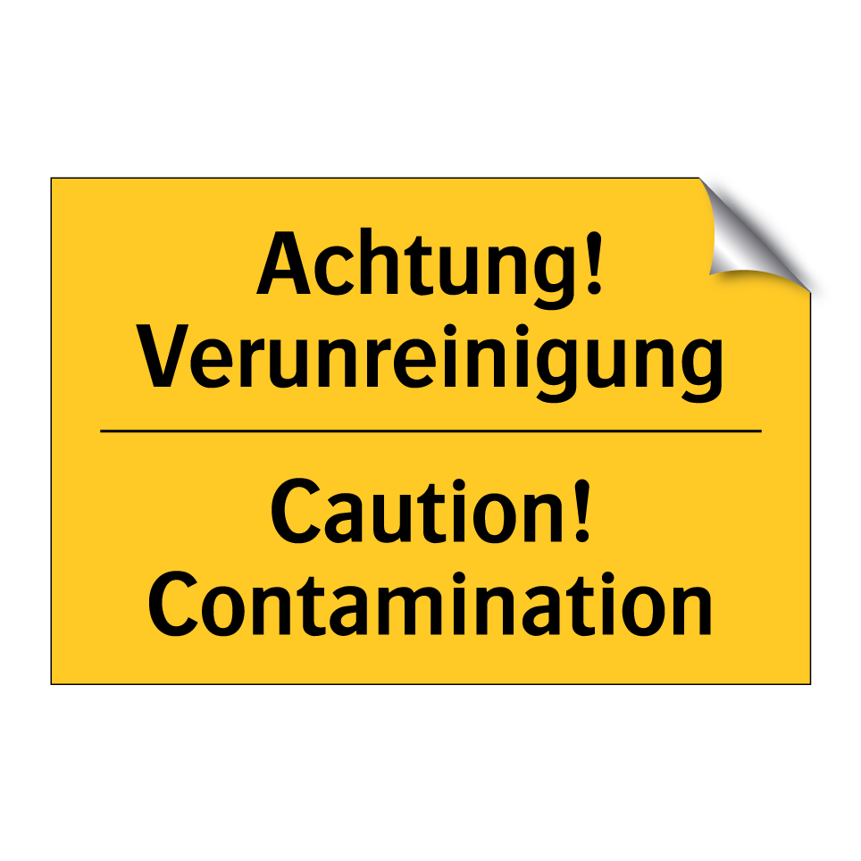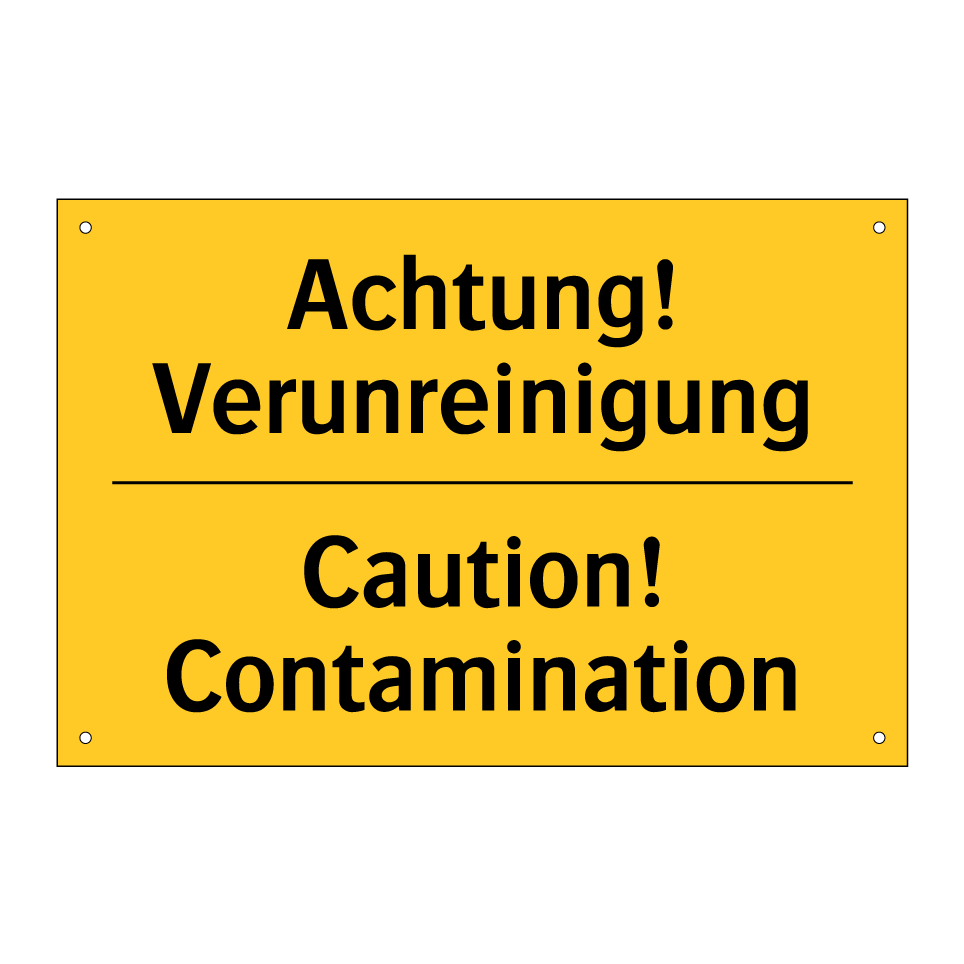 Zweisprachiges Warnschild mit deutschem Text Achtung! Verunreinigung und englischem Text Caution! Contamination
