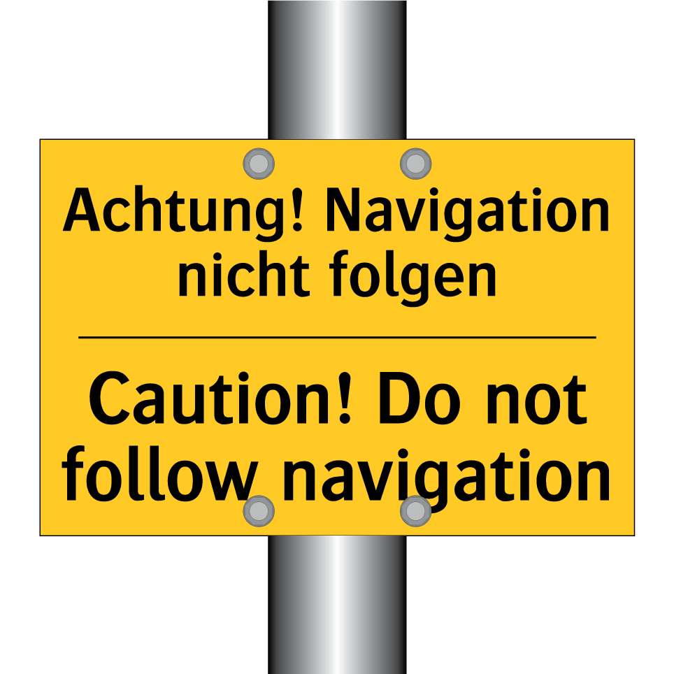 Zweisprachiges Warnschild mit deutschem Text Achtung! Navigation nicht folgen und englischem Text Caution! Do not follow navigation