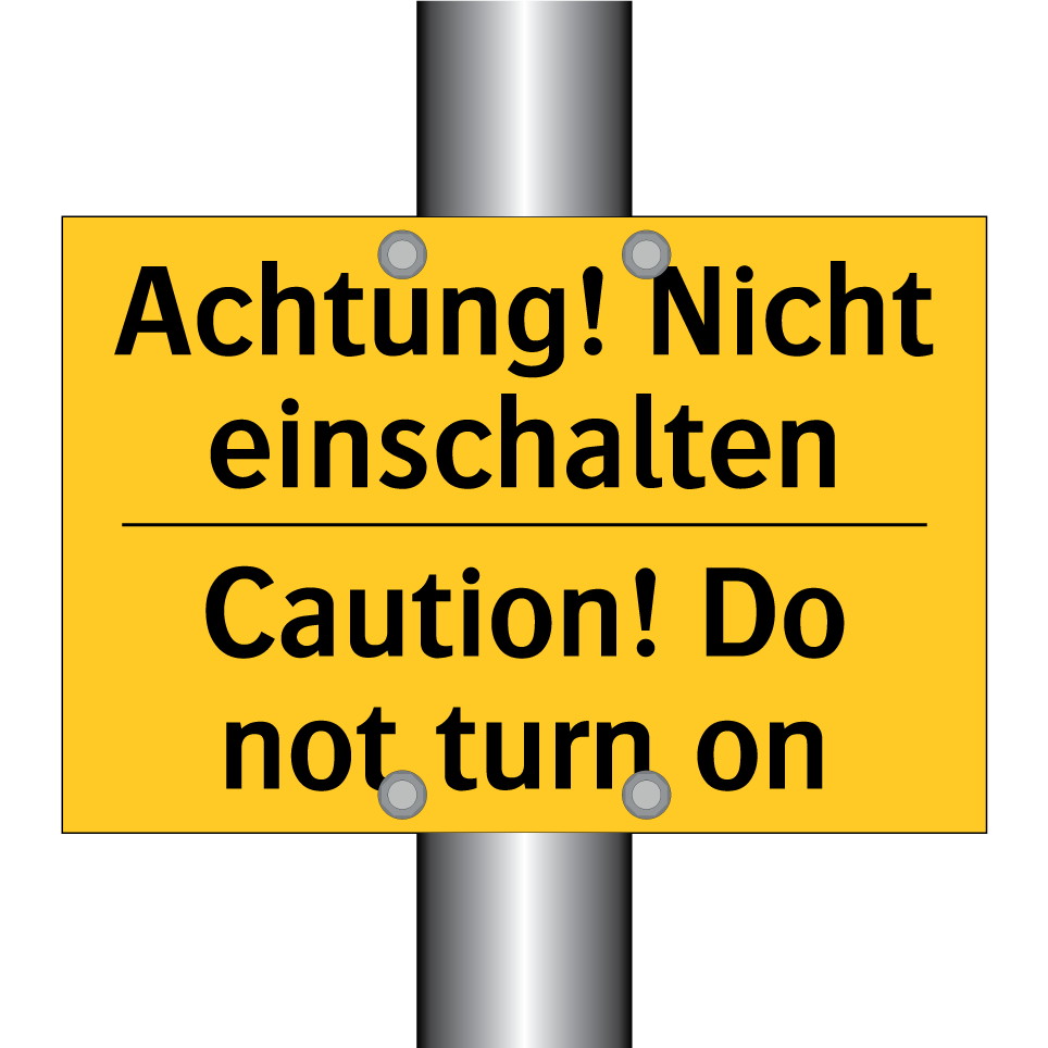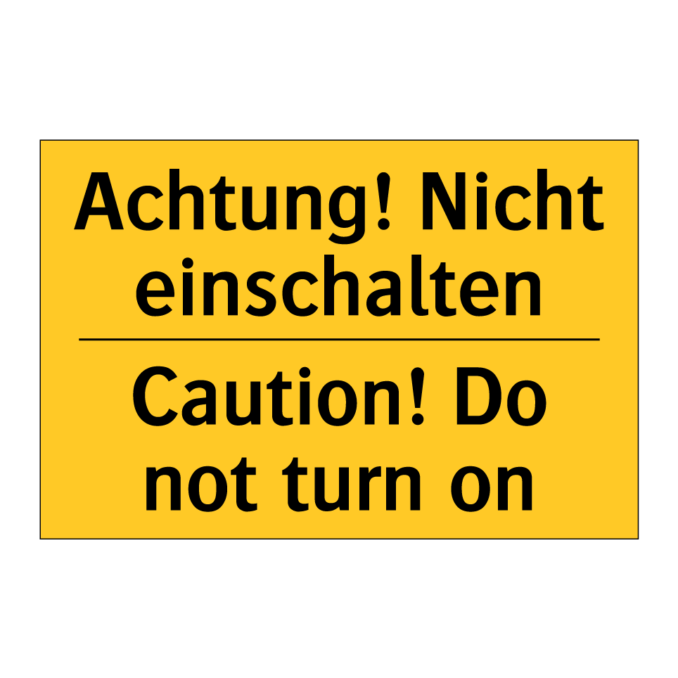 Zweisprachiges Warnschild mit deutschem Text Achtung! Nicht einschalten und englischem Text Caution! Do not turn on