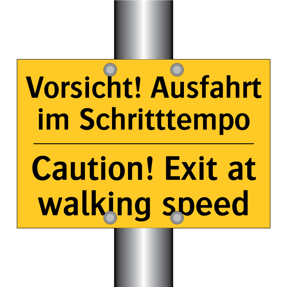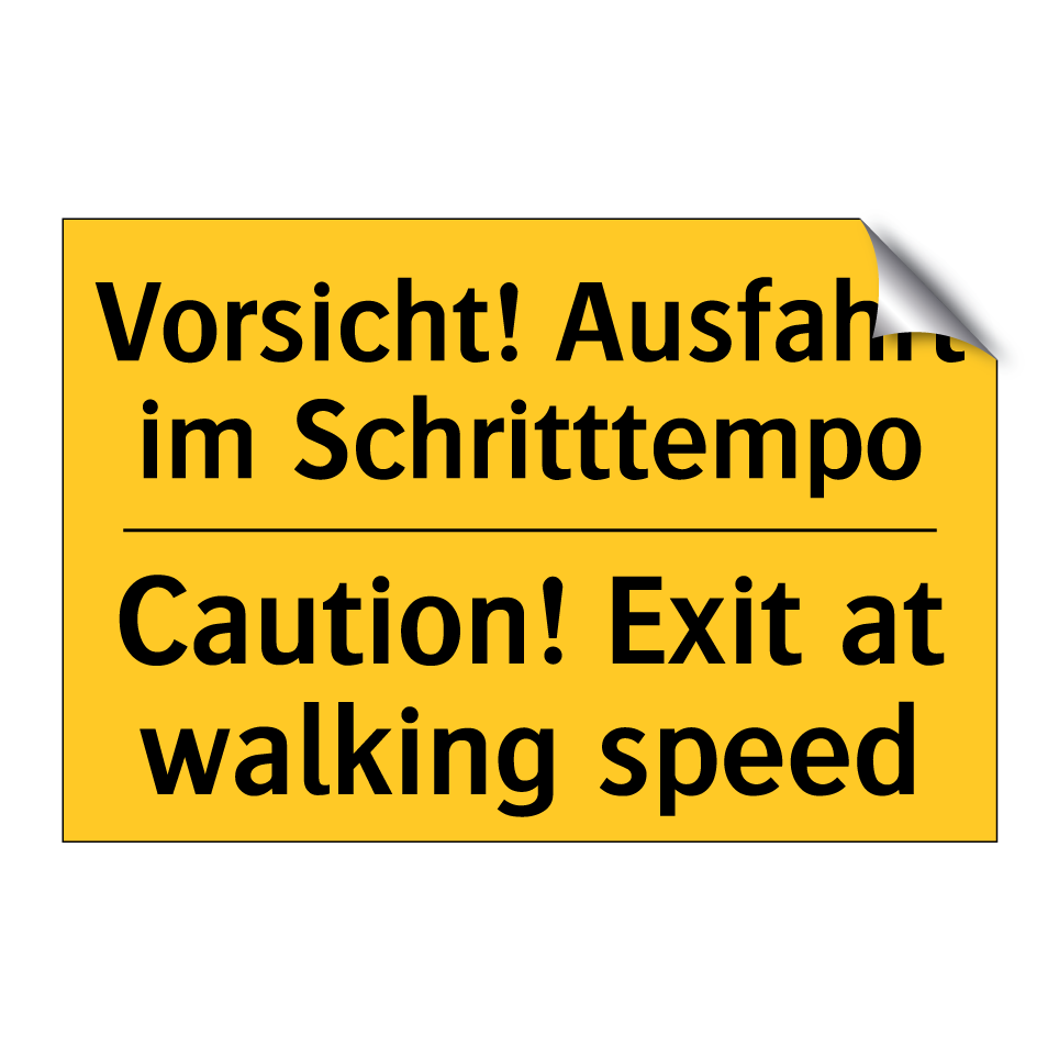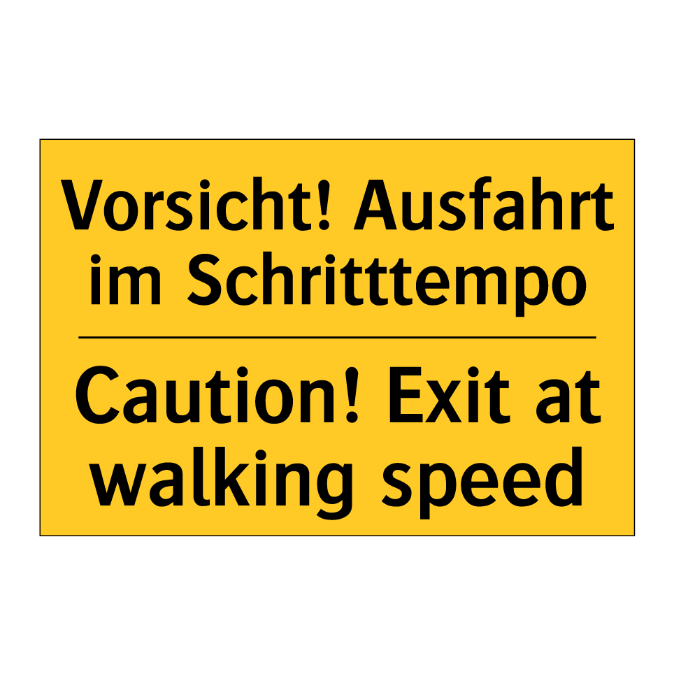 Zweisprachiges Warnschild mit deutschem Text Vorsicht! Ausfahrt im Schritttempo und englischem Text Caution! Exit at walking speed
