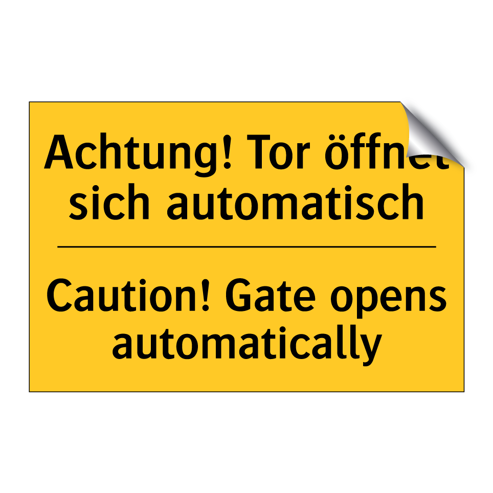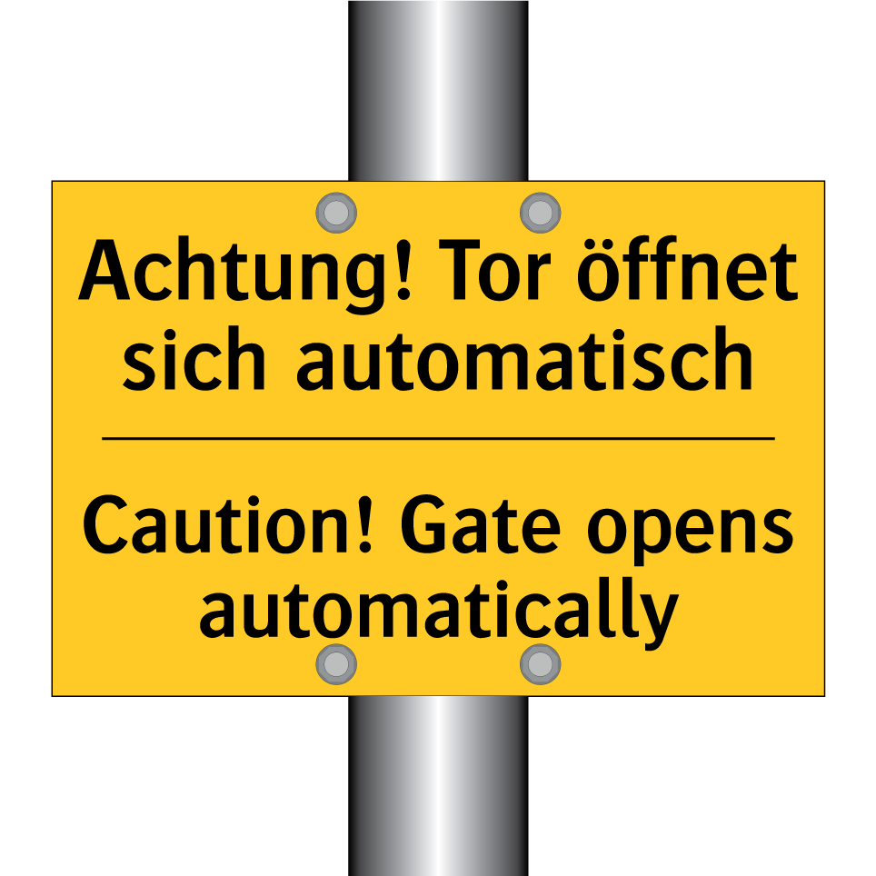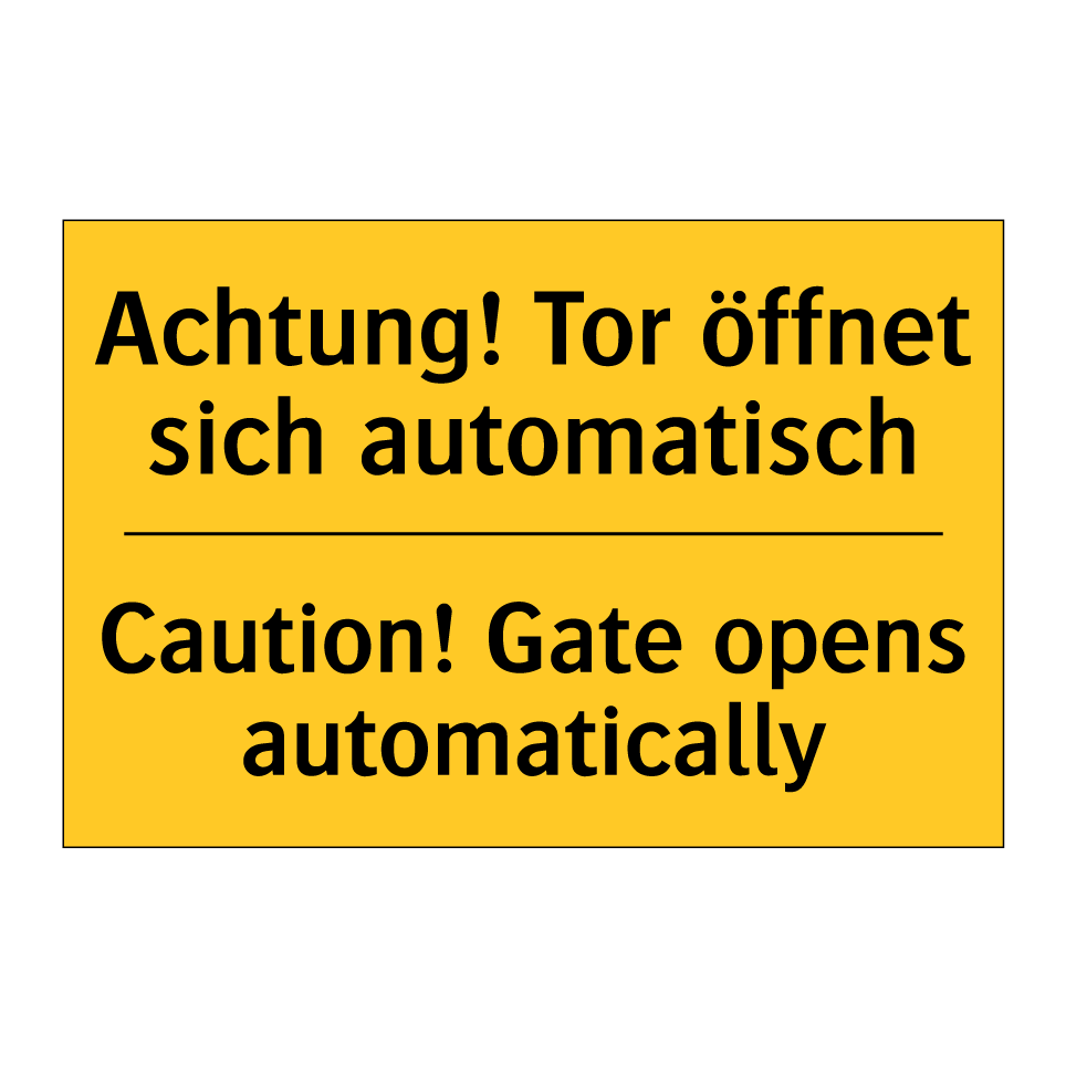 Zweisprachiges Warnschild mit deutschem Text Achtung! Tor öffnet sich automatisch und englischem Text Caution! Gate opens automatically