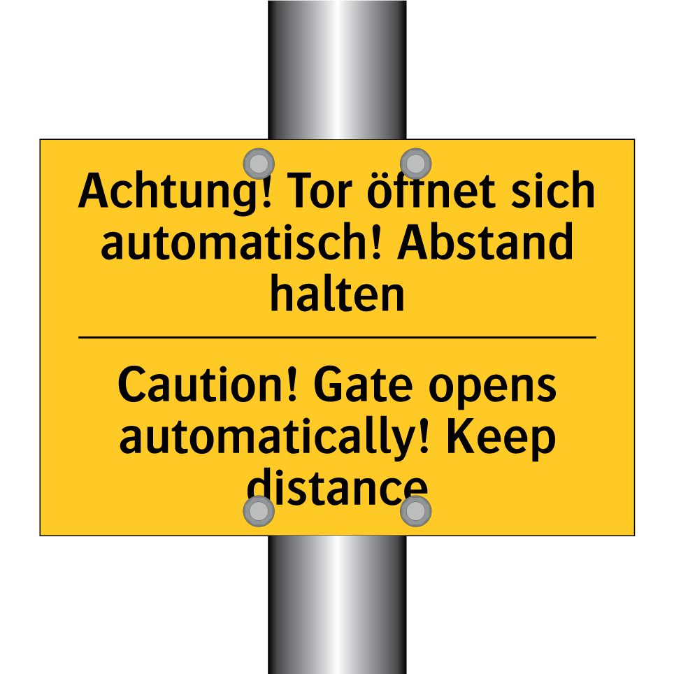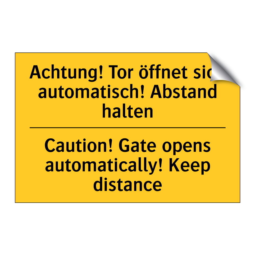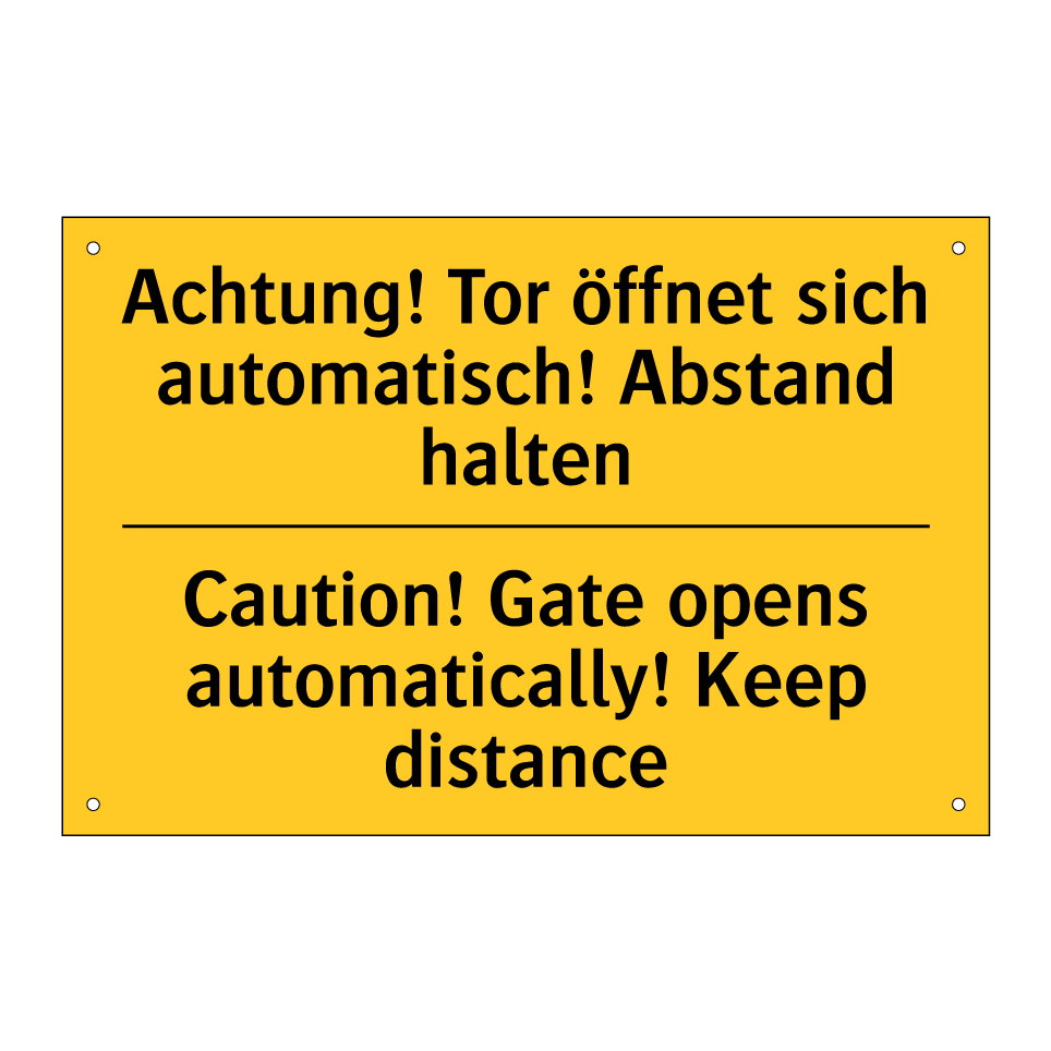 Zweisprachiges Warnschild mit deutschem Text Achtung! Tor öffnet sich automatisch! Abstand halten und englischem Text Caution! Gate opens automatically! Keep distance