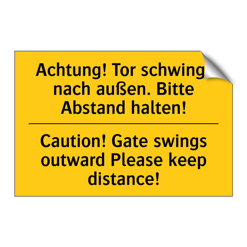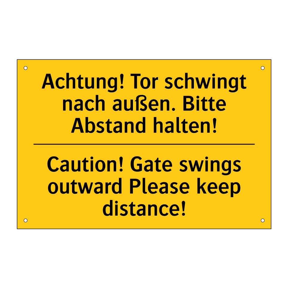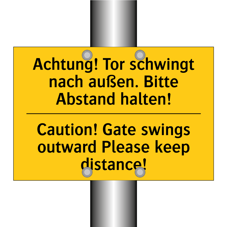 Zweisprachiges Warnschild mit deutschem Text Achtung! Tor schwingt nach außen. Bitte Abstand halten! und englischem Text Caution! Gate swings outward Please keep distance!
