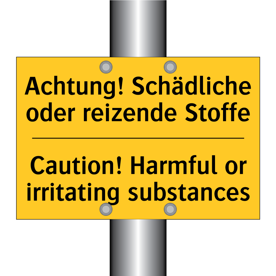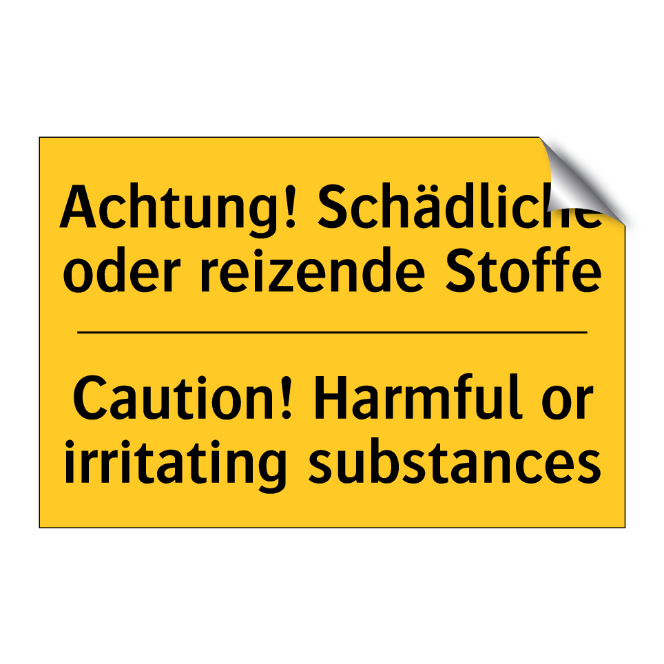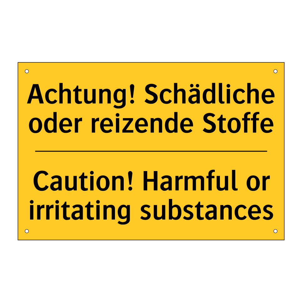 Zweisprachiges Warnschild mit deutschem Text Achtung! Schädliche oder reizende Stoffe und englischem Text Caution! Harmful or irritating substances