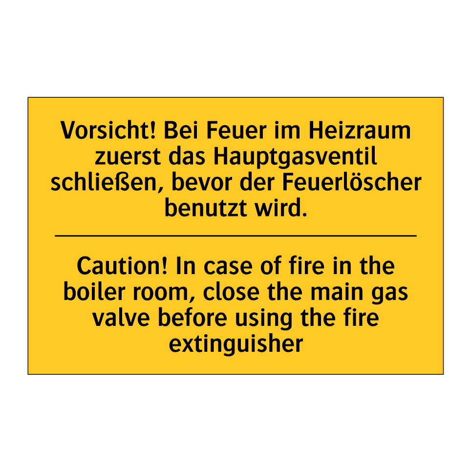 Zweisprachiges Warnschild mit deutschem Text Vorsicht! Bei Feuer im Heizraum zuerst das Hauptgasventil schließen, bevor der Feuerlöscher benutzt wird. und englischem Text Caution! In case of fire in the boiler room, close the main gas valve before using the fire extinguisher