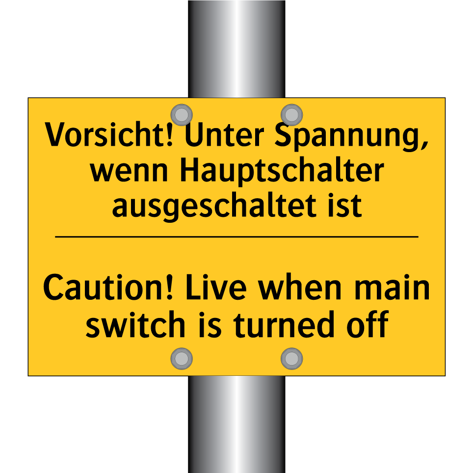 Zweisprachiges Warnschild mit deutschem Text Vorsicht! Unter Spannung, wenn Hauptschalter ausgeschaltet ist und englischem Text Caution! Live when main switch is turned off