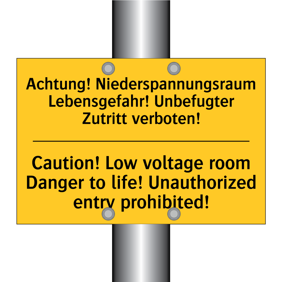 Zweisprachiges Warnschild mit deutschem Text Achtung! Niederspannungsraum Lebensgefahr! Unbefugter Zutritt verboten! und englischem Text Caution! Low voltage room Danger to life! Unauthorized entry prohibited!