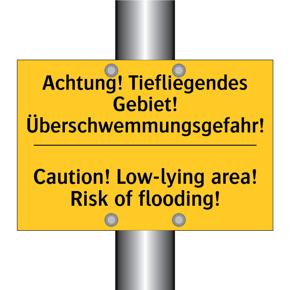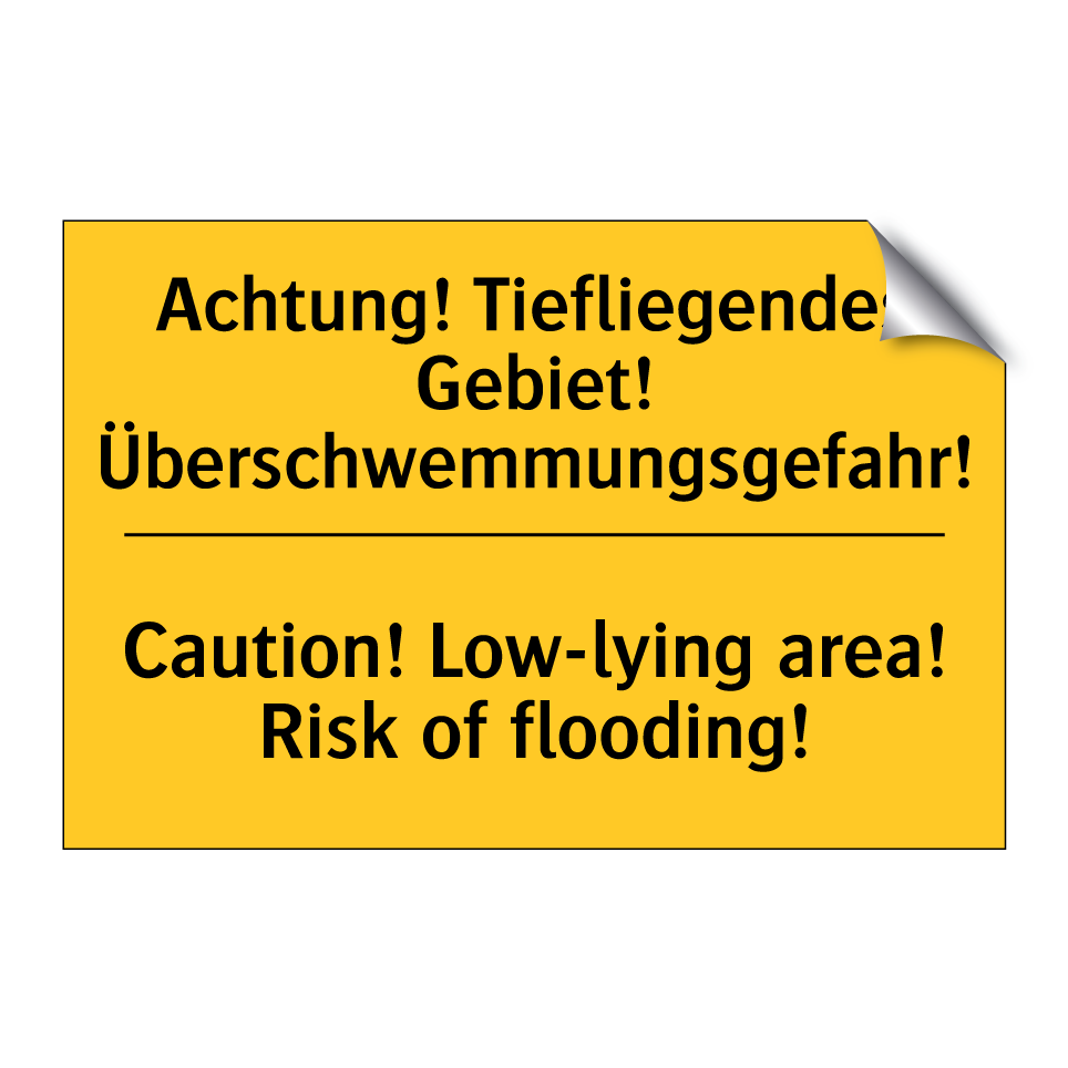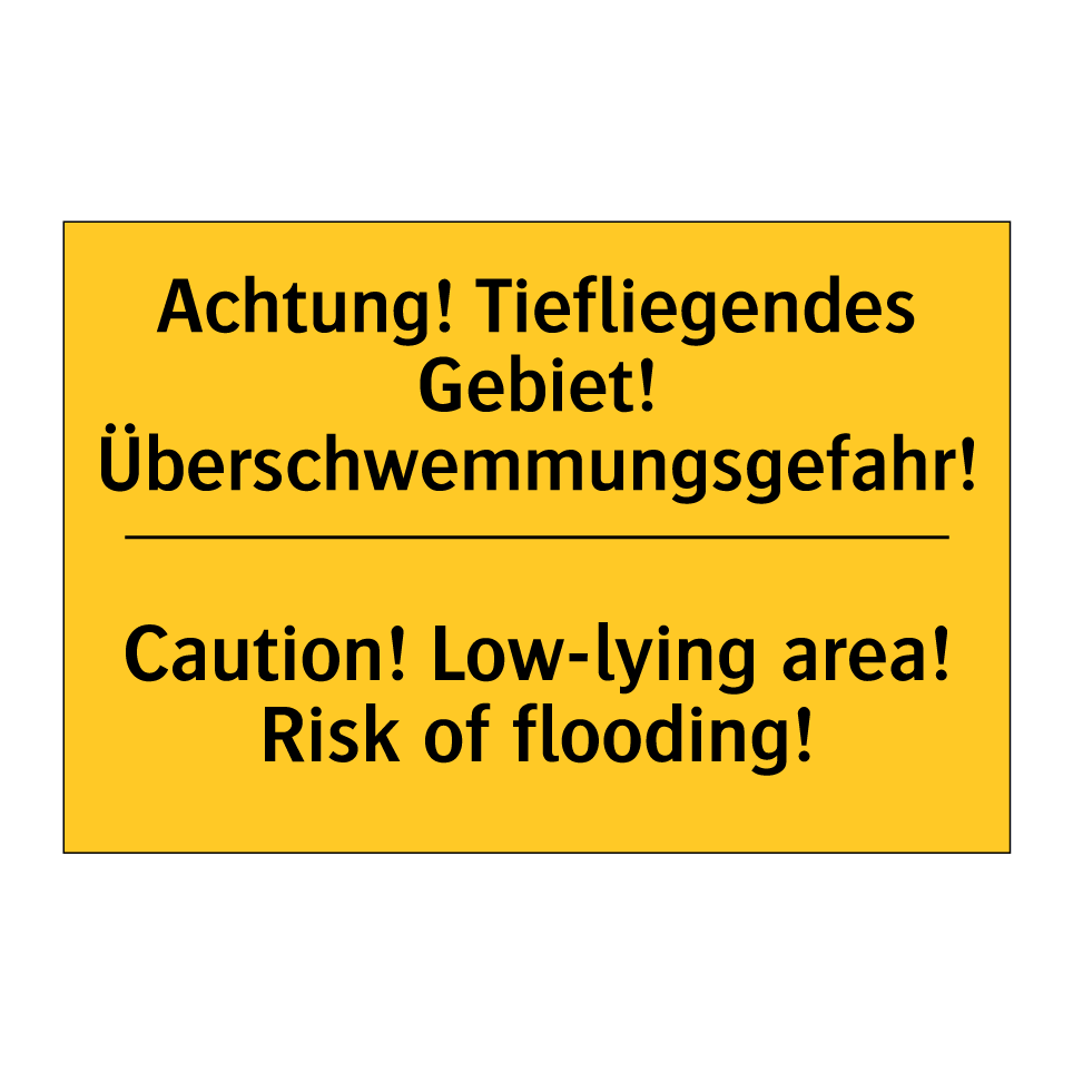 Zweisprachiges Warnschild mit deutschem Text Achtung! Tiefliegendes Gebiet! Überschwemmungsgefahr! und englischem Text Caution! Low-lying area! Risk of flooding!