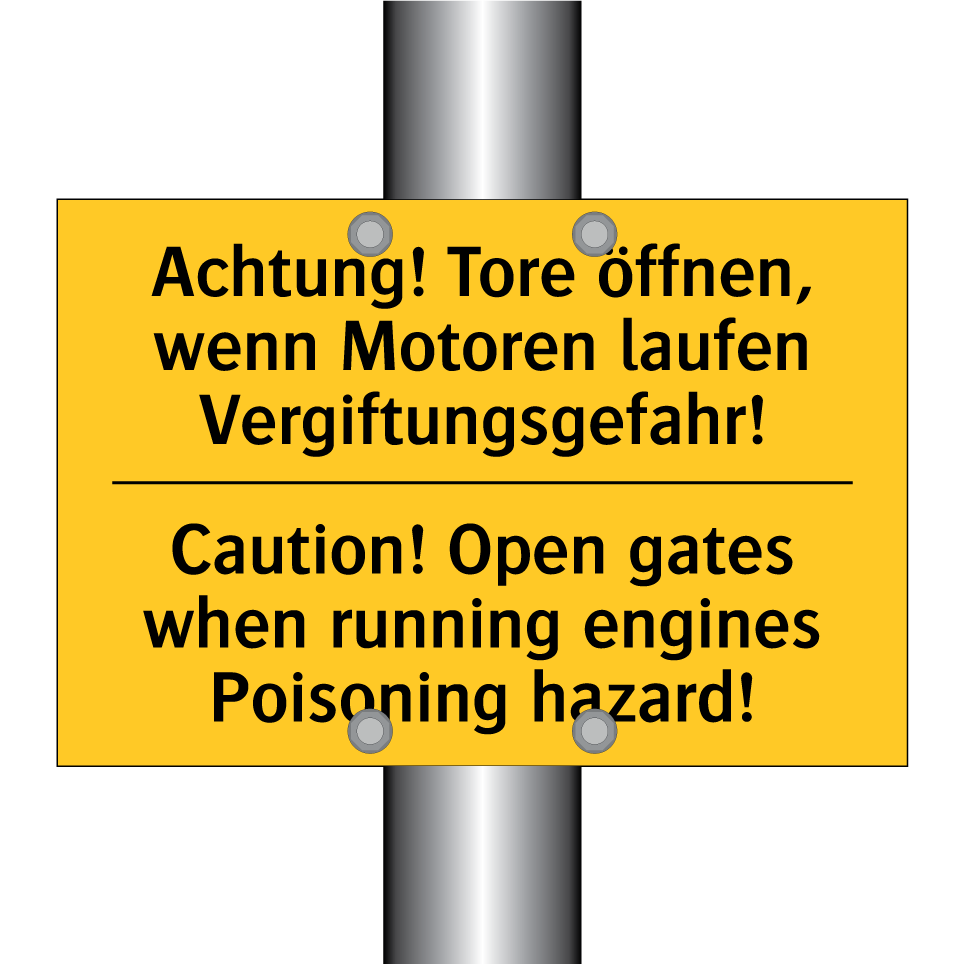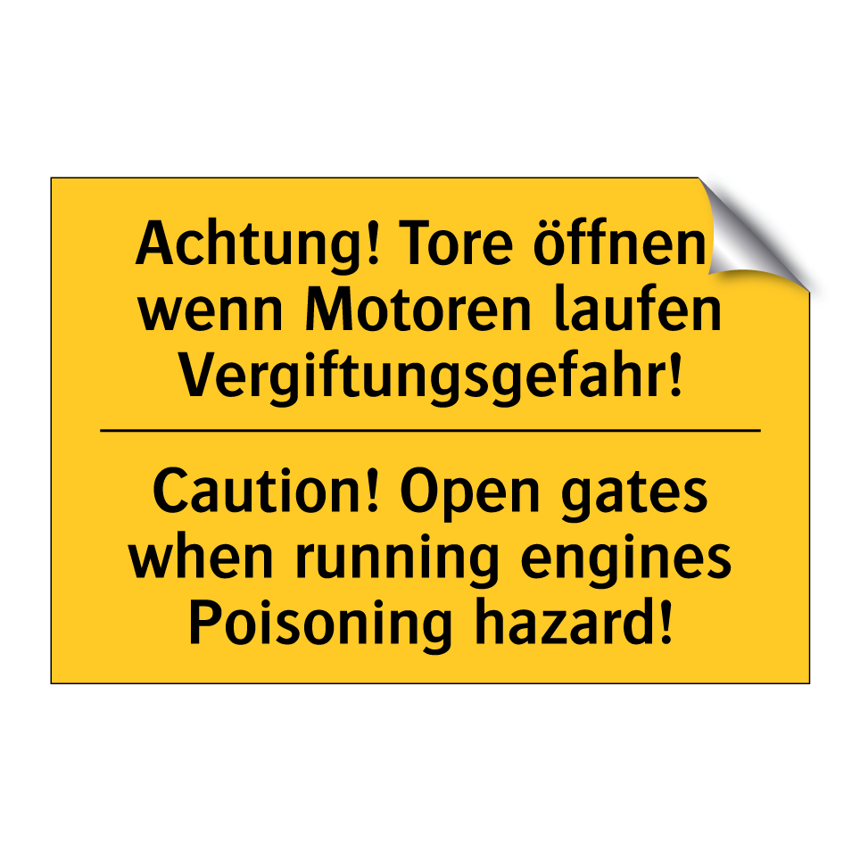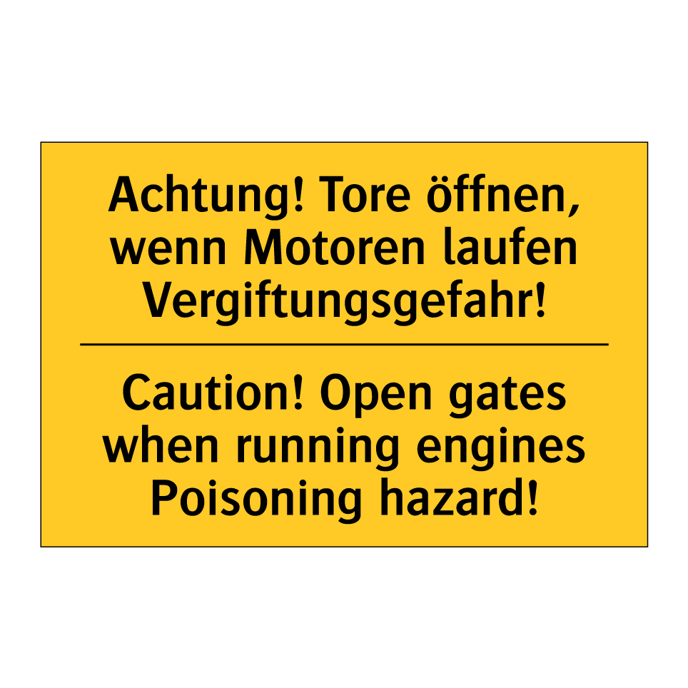 Zweisprachiges Warnschild mit deutschem Text Achtung! Tore öffnen, wenn Motoren laufen Vergiftungsgefahr! und englischem Text Caution! Open gates when running engines Poisoning hazard!