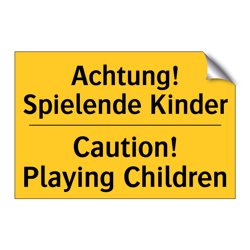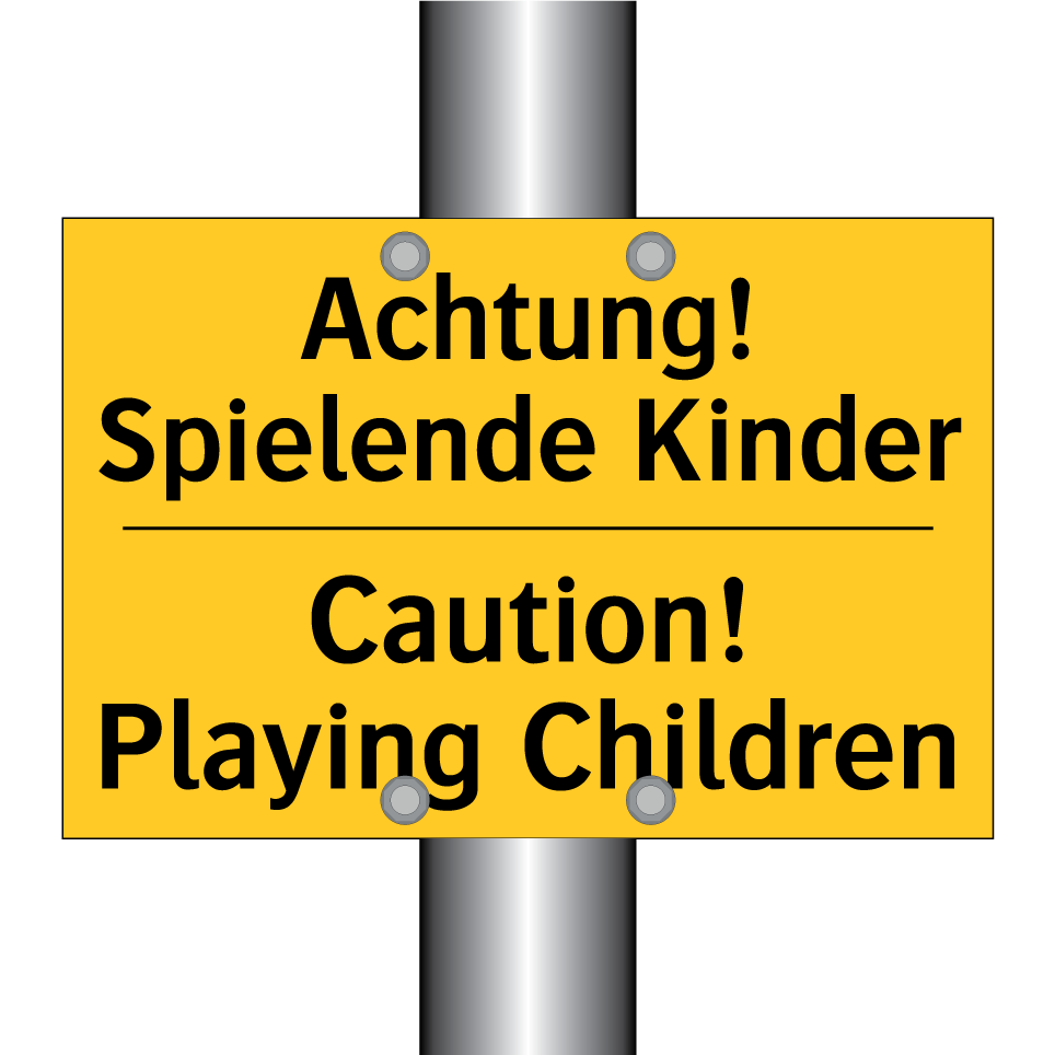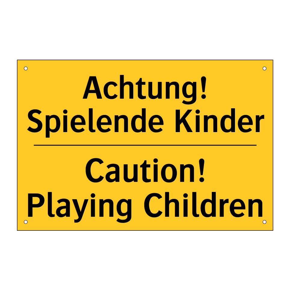 Zweisprachiges Warnschild mit deutschem Text Achtung! Spielende Kinder und englischem Text Caution! Playing Children