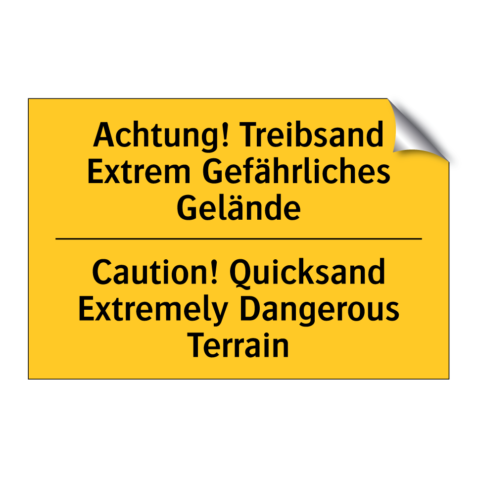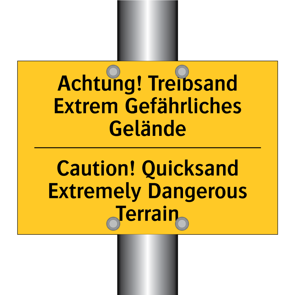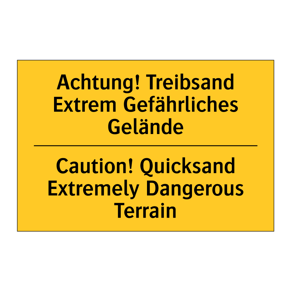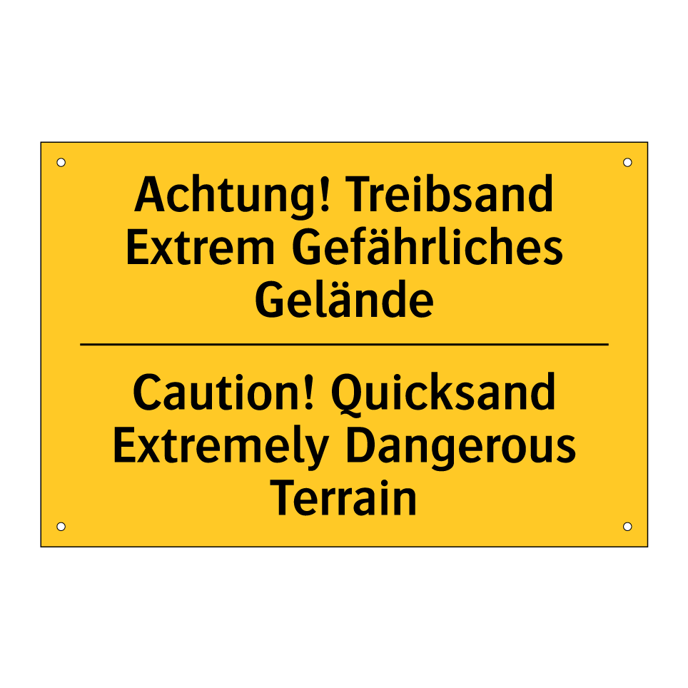 Zweisprachiges Warnschild mit deutschem Text Achtung! Treibsand Extrem Gefährliches Gelände und englischem Text Caution! Quicksand Extremely Dangerous Terrain